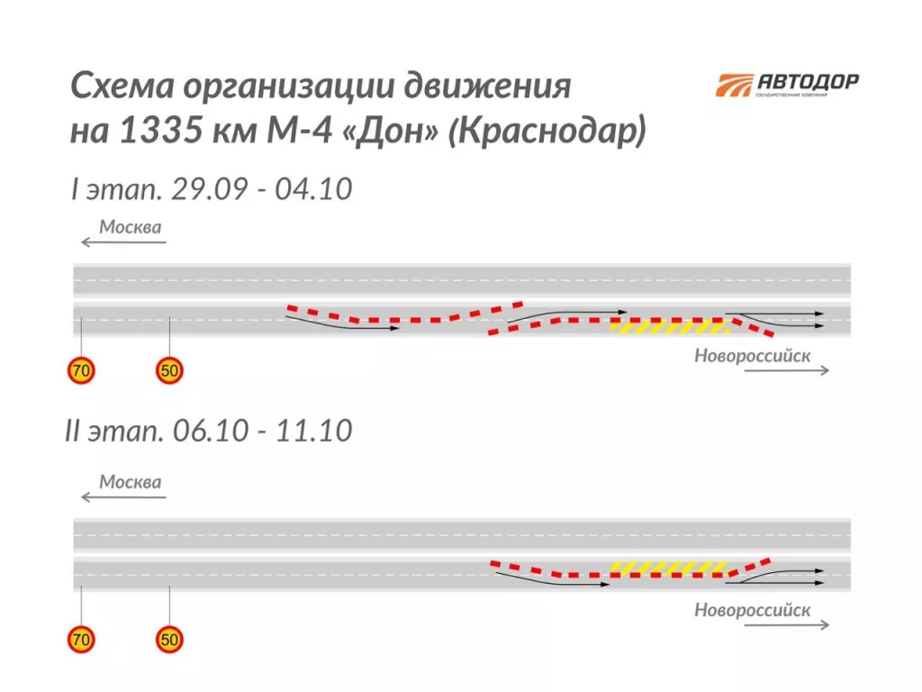 С 29 сентября по 4 октября рабочие поменяют гидроизоляцию и асфальтобетонное покрытие на крайней правой полосе 1335-го км трассы М4 «Дон». В это время транспорт пустят по левой полосе, а максимально разрешенная скорость снизится до 50 км/час.