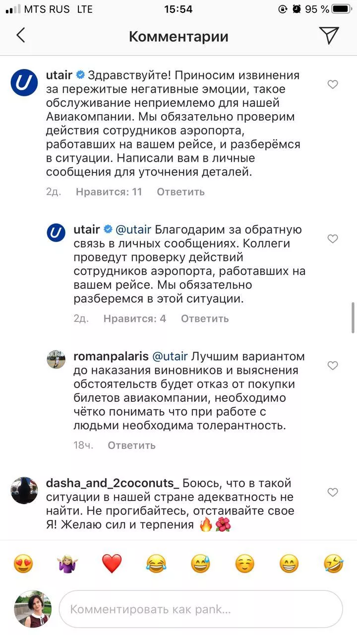 Представители компании Utair в комментариях к посту Тураевой принесли извинения спортсменке «за пережитые негативные эмоции». Женщину уверили, что будет проведена проверка действий сотрудников аэропорта, работавших на рейсе, а также что такое обслуживание является недопустимым для авиакомпании.