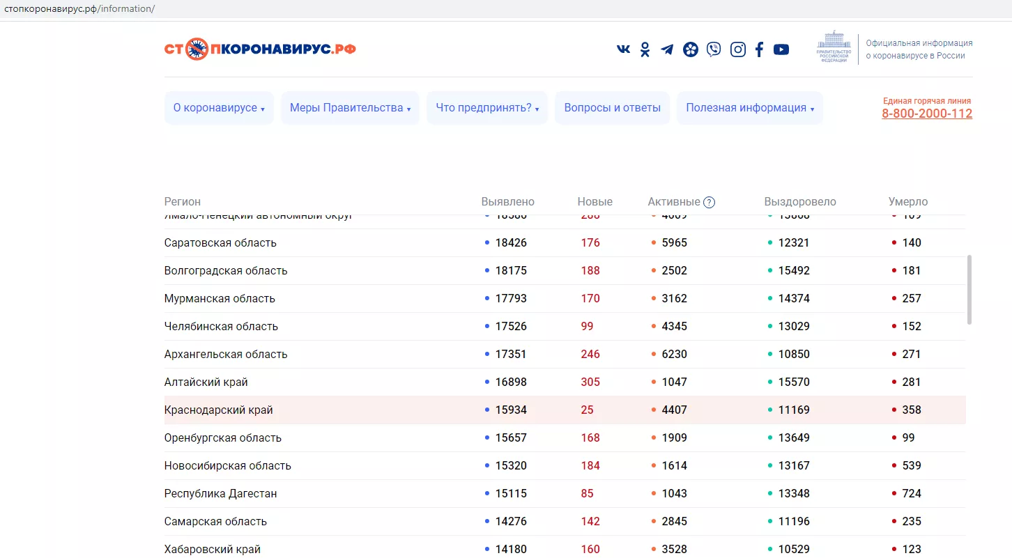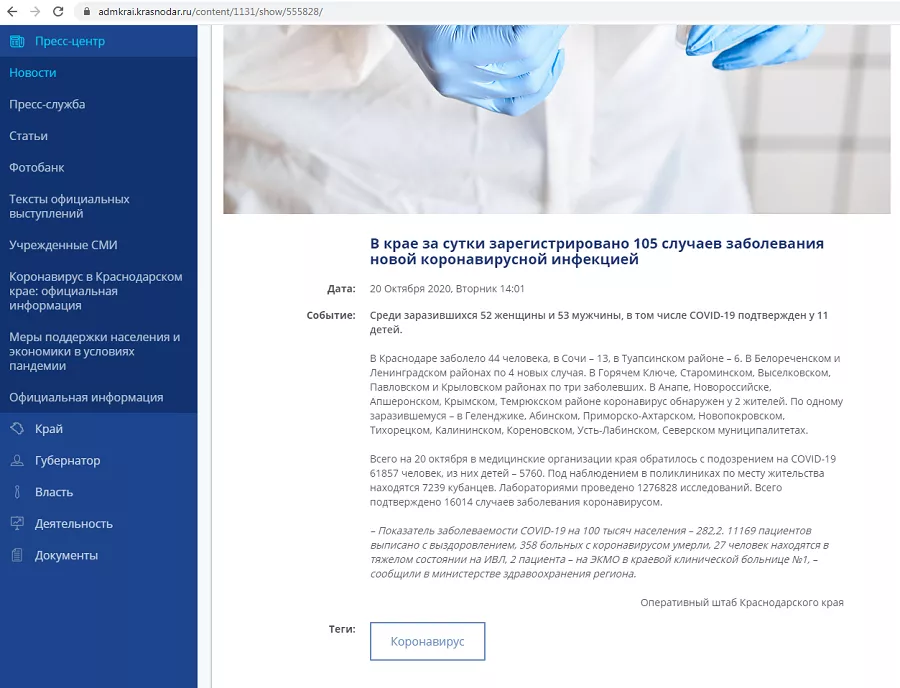 Федеральный оперштаб публикует статистику по коронавирусу около 10:30, однако 20 октября новые данные появились только в 13:30. При этом цифры по заболеваемости COVID-19 в Краснодарском оказались необычно низкими. Если 18 октября на Кубани зарегистрировали 106 случаев коронавируса, а 19-го — 102, то 20 октября в регионе выявили 25 заболевших.