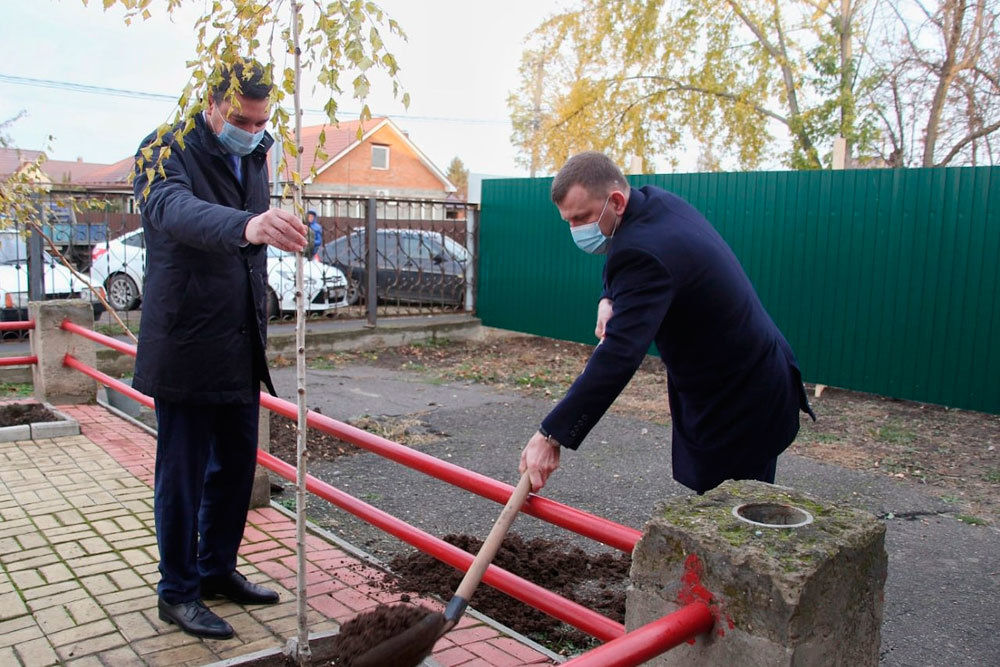 После осмотра котлована Евгений Первышов принял участие в высадке декоративных берез у мемориала «Защитникам Отечества». Его установили на территории школы в 2010 году за счет станичных предпринимателей.