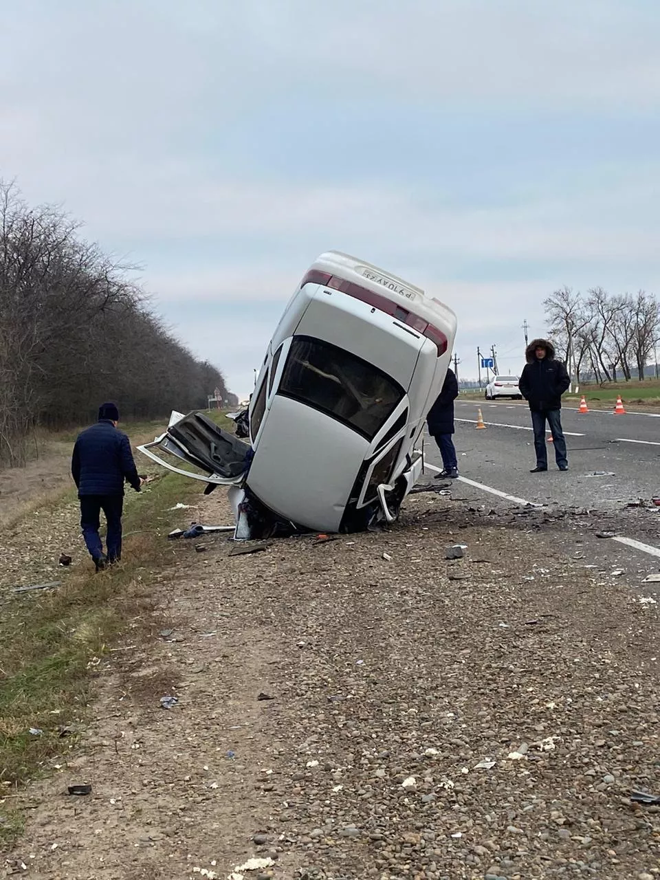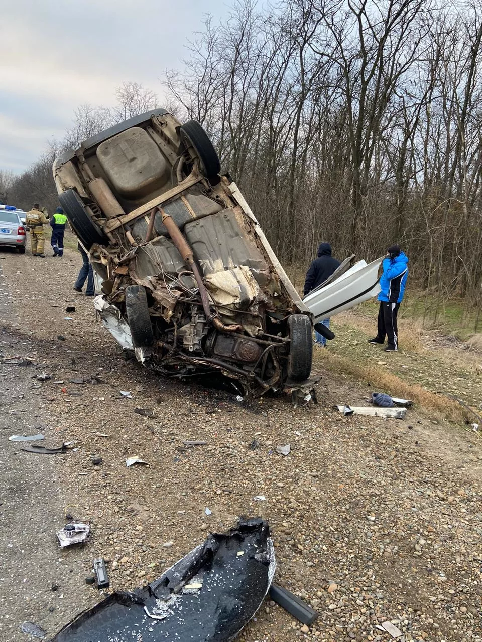Сообщение о ДТП поступило дежурному МВД в 6:40. На 135-м километре трассы Краснодар — Ейск столкнулись три машины. По предварительным данным, водитель ВАЗ-21099 выехал на встречку и лоб в лоб столкнулся с автомобилем ВАЗ-2110. От удара «десятка» перевернулась на крышу.