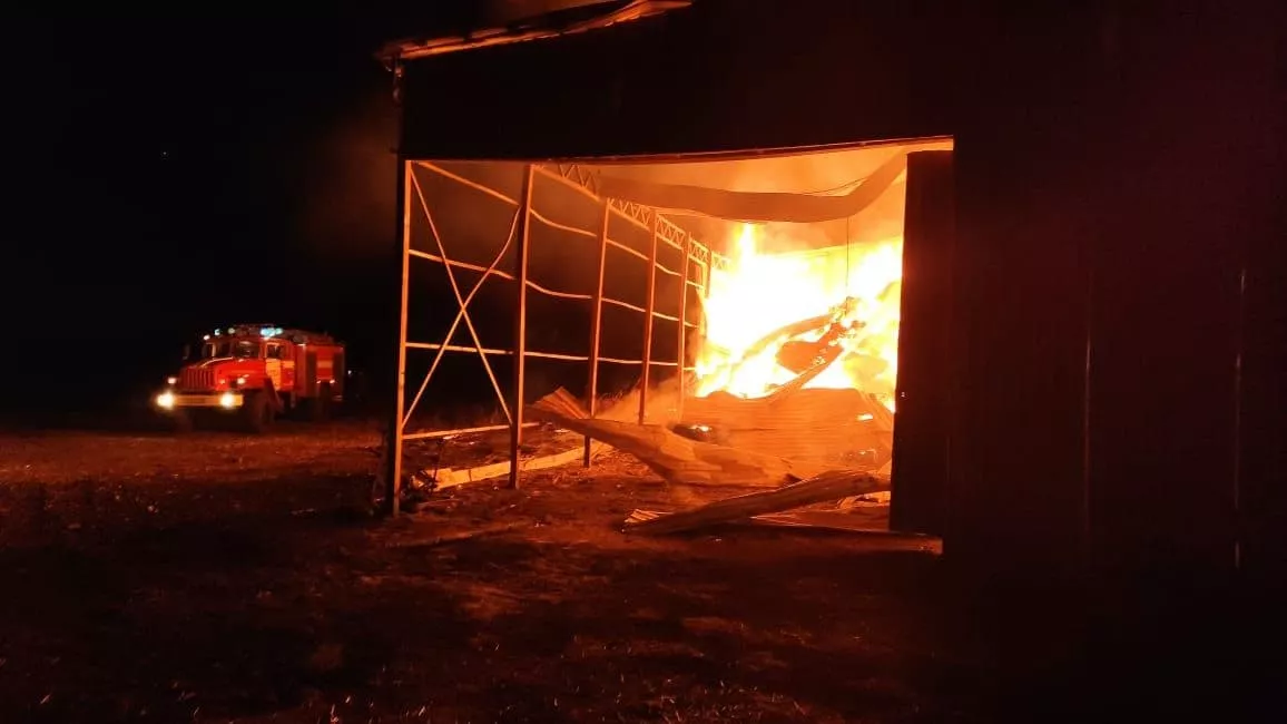 Сообщение о пожаре в 2 км от станицы Старокорсунской поступило в 17:04. Прибывшие в 17:20 пожарно-спасательные подразделения установили, что горит металлический ангар с сеном на площади 450 кв. метров.