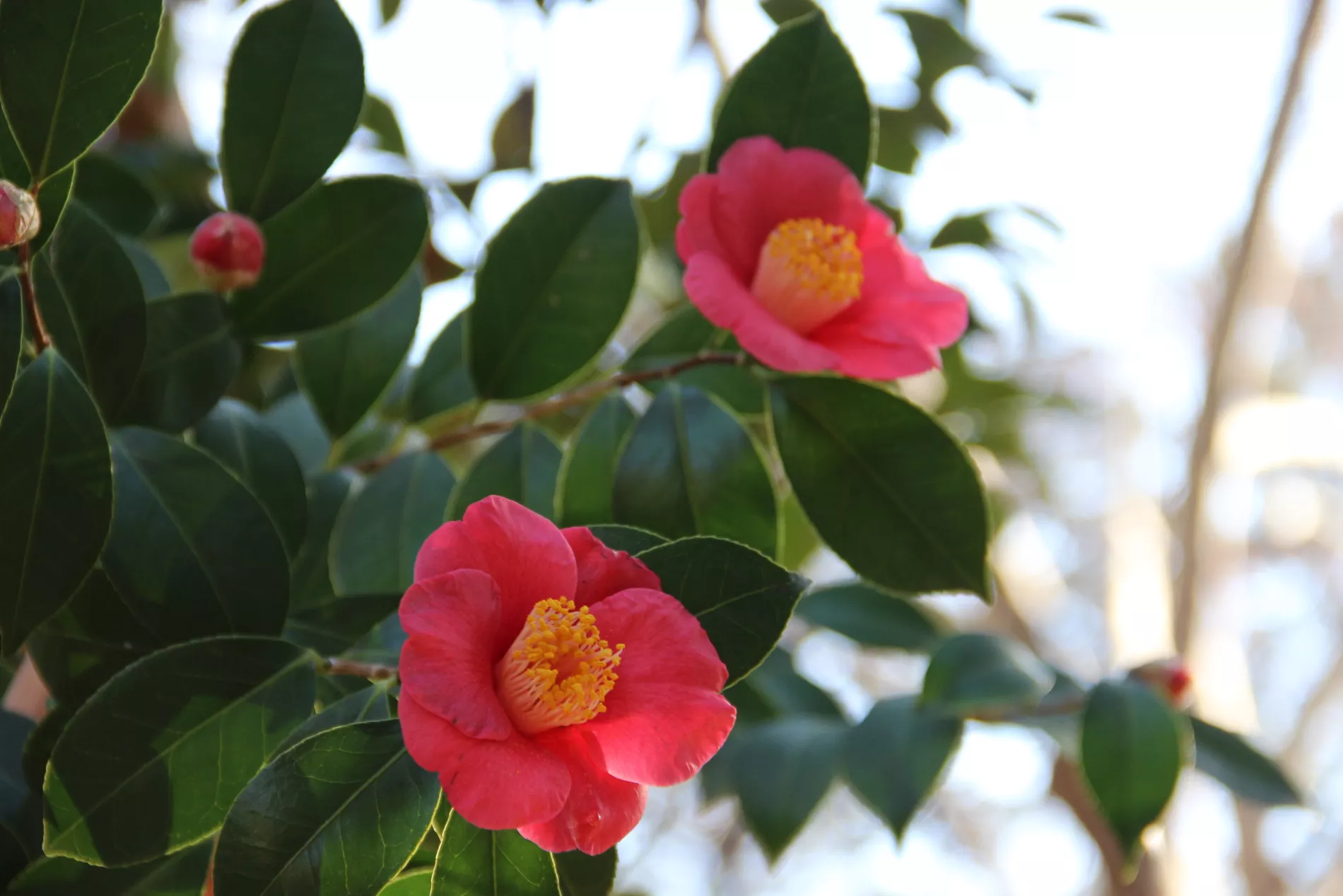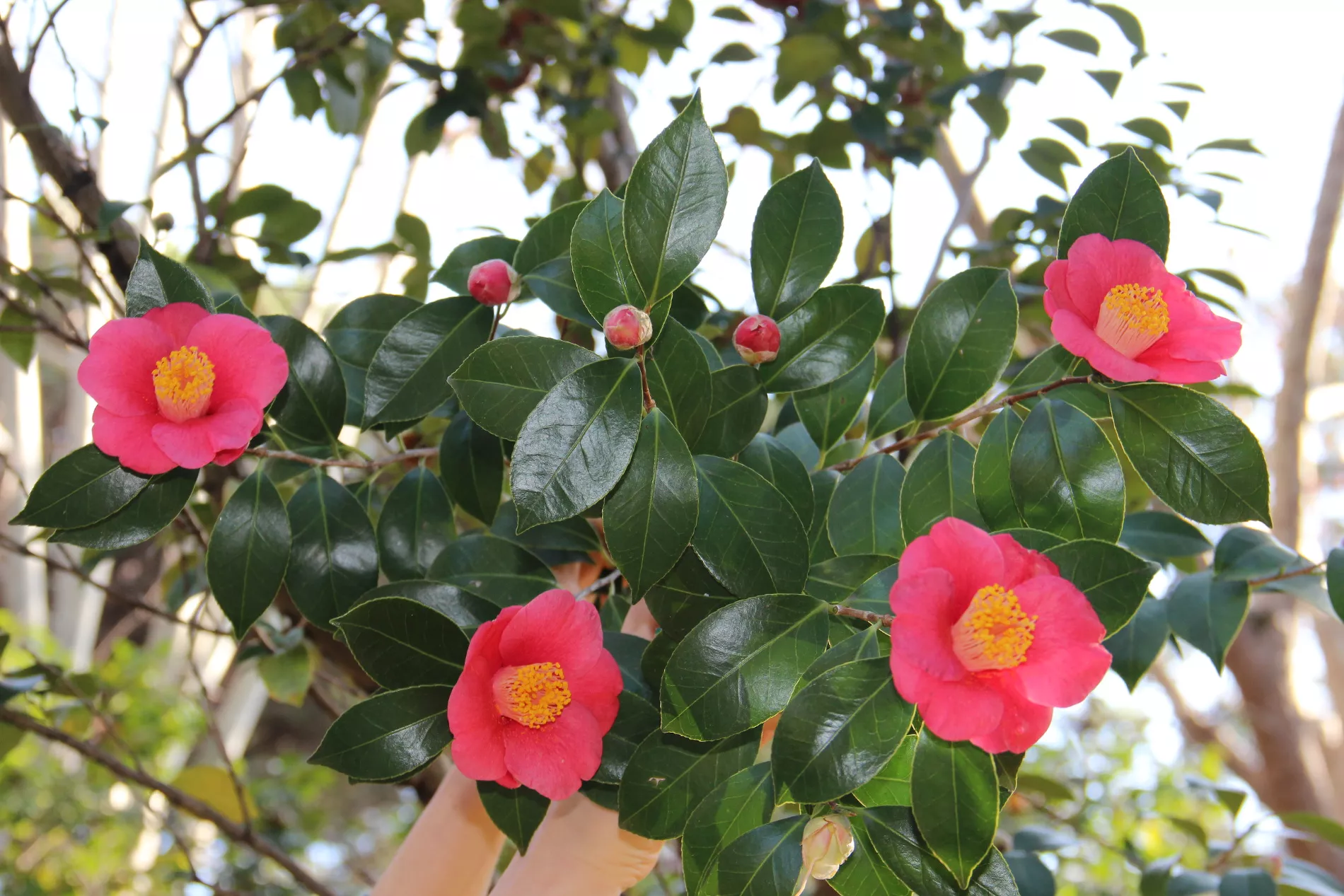 Цветение дерева может длиться до четырех месяцев. Бутоны камелии опадают целыми соцветиями, не рассыпаясь на лепестки.