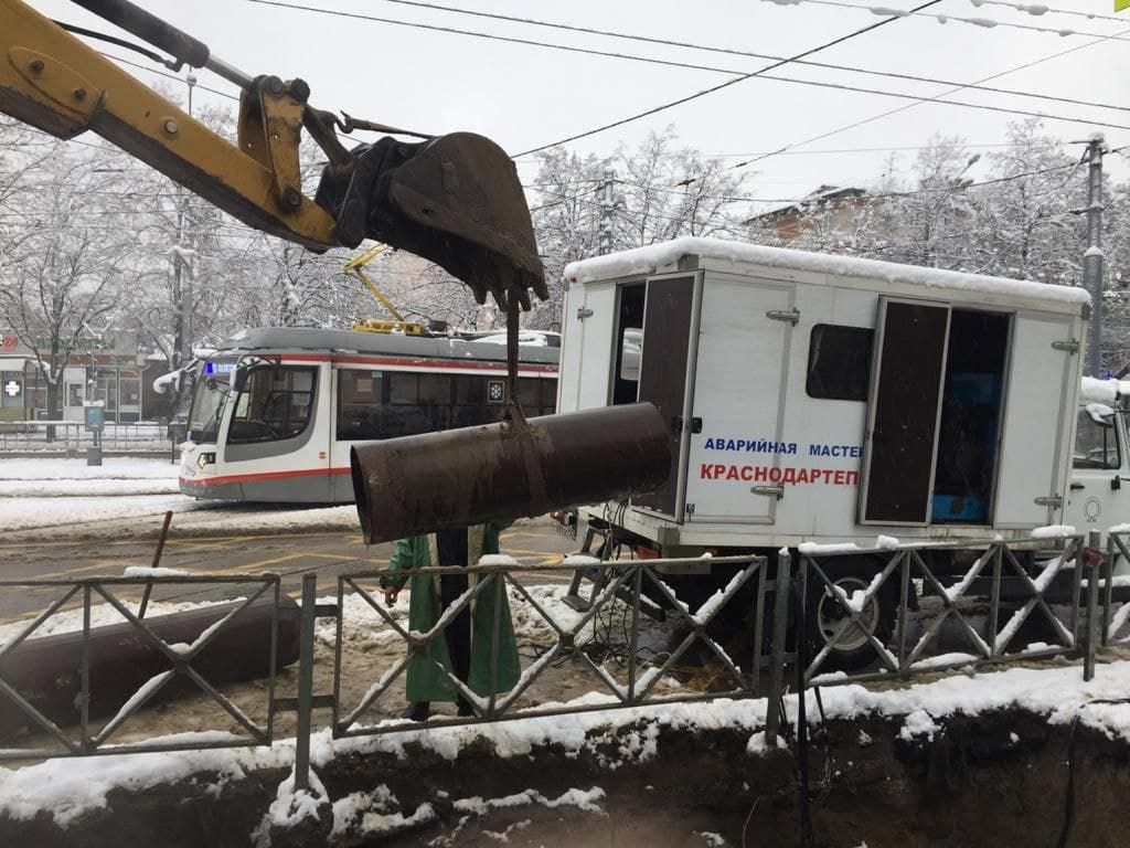 Аварию устраняют 10 специалистов «АТЭК» и 6 единиц техники. Мэр Краснодара Евгений Первышов побывал на месте происшествия и написал в своем телеграме, что поручил завершить ремонтно-восстановительные работы до конца дня.