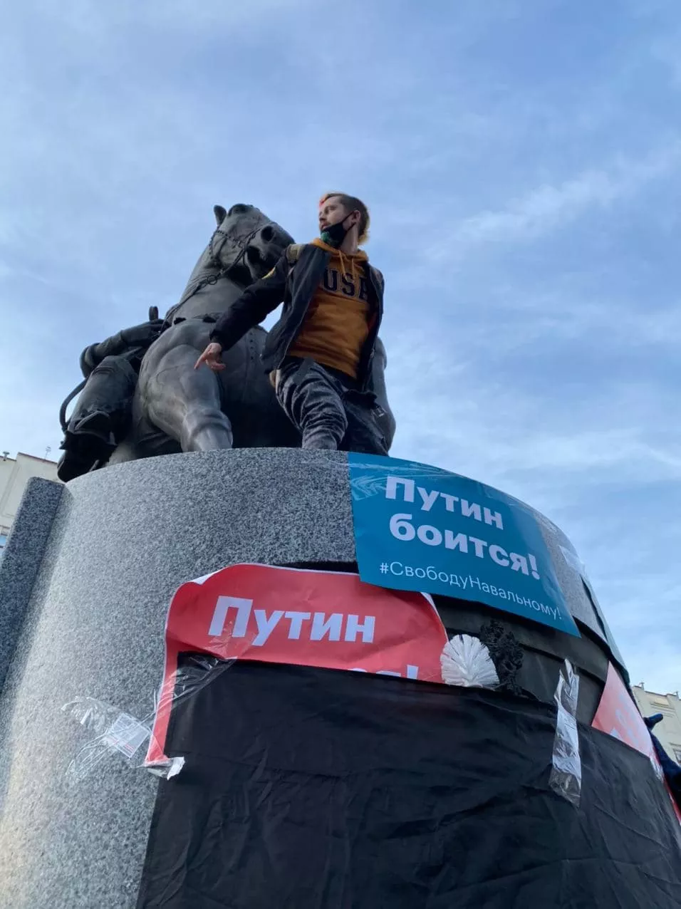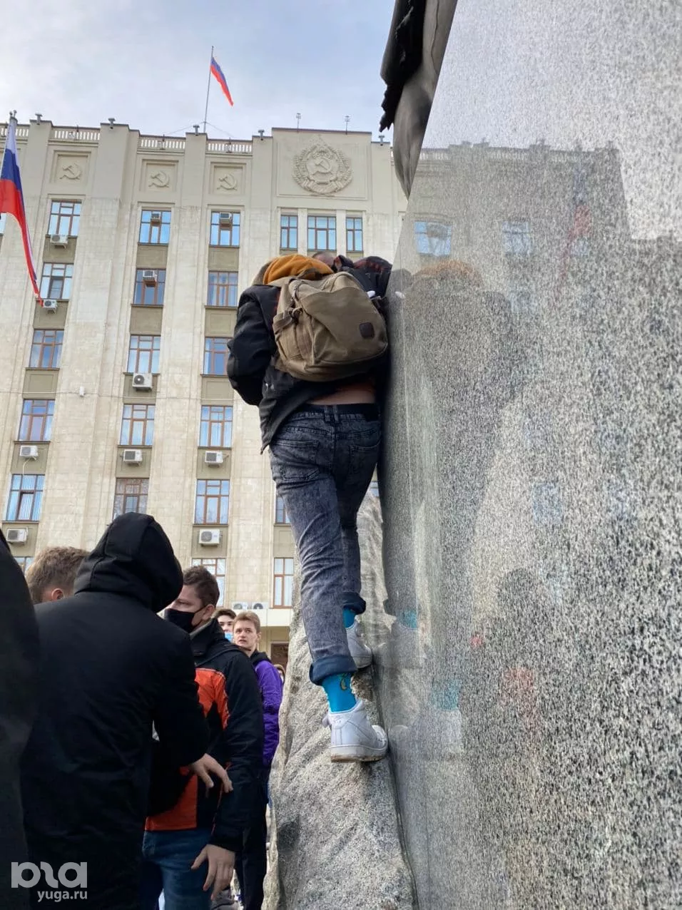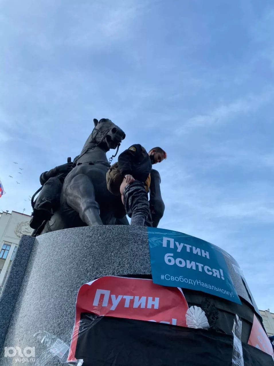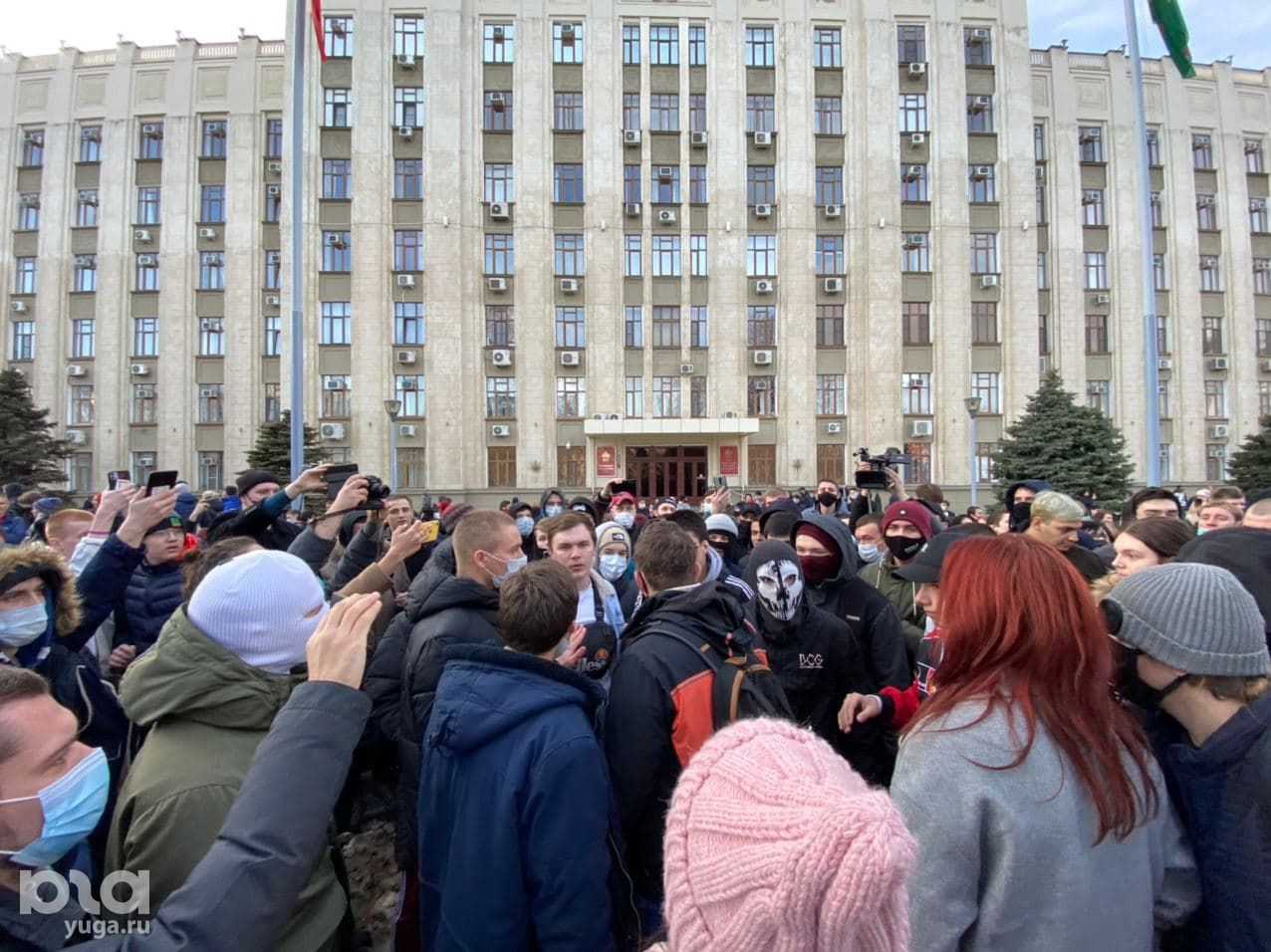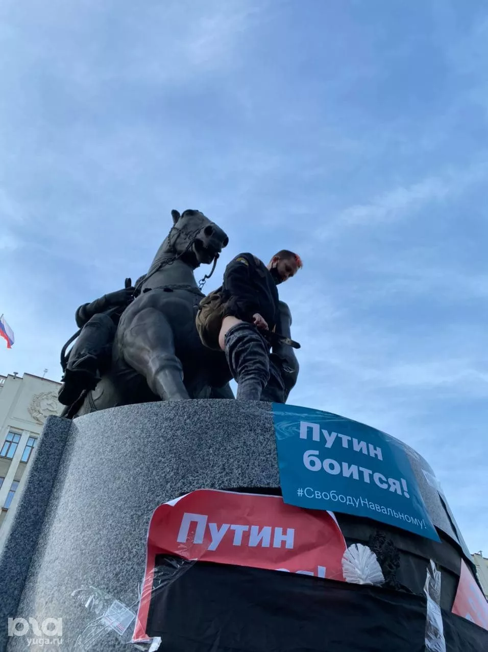 Напомним, 23 января по всей России прошли митинги в поддержку задержанного оппозиционера Алексея Навального. Портал Юга.ру вел текстовую трансляцию протестов в Краснодаре. На мероприятии около 16:20 один из участников залез на памятник кубанскому казачеству возле здания краевой администрации и обнажил ягодицы. Журналист Юга.ру, который в этот момент находился рядом, сообщал, что участники акции начали кричать на мужчину, называя провокатором, а когда он спускался — его закидали снежками. После этого несколько протестующих из толпы подбежали и ударили его, началась драка, которую быстро остановили.