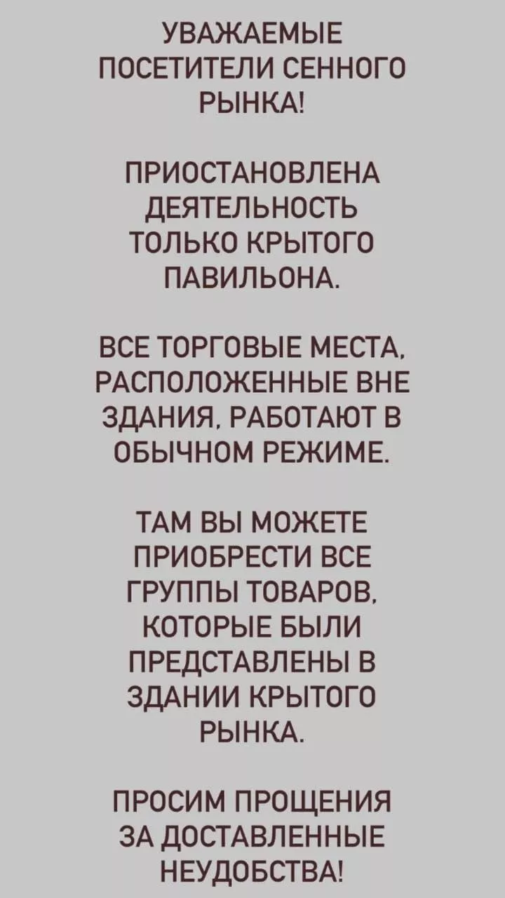 Как уточнили в сторис в инстаграме Сенного рынка, приостановлена деятельность только крытого торгового павильона. Все торговые места, расположенные вне здания, работают в обычном режиме.