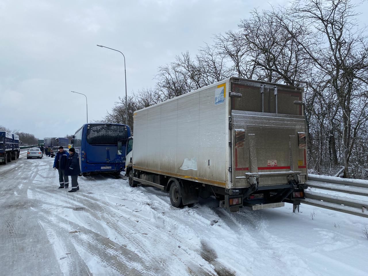 Сообщение о нескольких ДТП в районе станицы Северской, при повороте на хутор Свободный, поступило в дежурную часть в 9:30. По предварительным данным, на трассе А-146 столкнулись 17 машин в пяти ДТП. Среди них четыре грузовика, 12 легковых автомобилей и один рейсовый автобус.