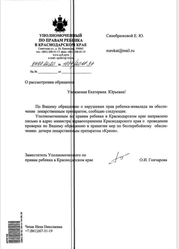 Что случилось? Жительница Геленджика Екатерина Синебрюкова воспитывает девятилетнюю дочь Вику. Девочка страдает муковисцидозом [заболевание, из-за которого в легких и органах желудочно-кишечного тракта скапливается слизь]. 25 февраля Синебрюкова опубликовала в своем инстаграме пост, в котором рассказала, что минздрав Кубани не обеспечивает ее дочь препаратом «Креон».