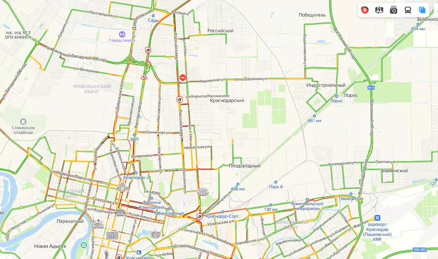 К 17:30 сервис показывал уже 9 баллов на дорогах Краснодара. Ожидается, что пробки начнут снижаться в ближайший час и к 20:00 достигнут 5 баллов. По наблюдениям журналиста Юга.ру, ближе к вечеру отмечается затрудненное движение трамваев, поскольку машины на нерегулируемых перекрестках не дают им проехать.