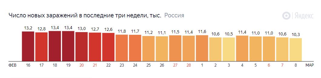 По официальным данным, в РФ за последние сутки коронавирус выявили у 10 тыс. 253 человек. За весь период пандемии в стране известно о 4 млн 333 тыс. 29 заболевших. Из них 89 тыс. 473 умерли (+379), а 3 млн 922 тыс. 246 человек выздоровели (+10 тыс. 322).