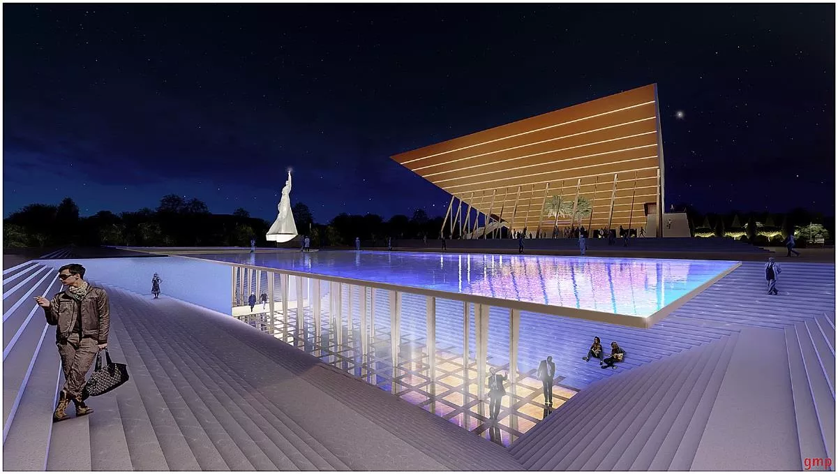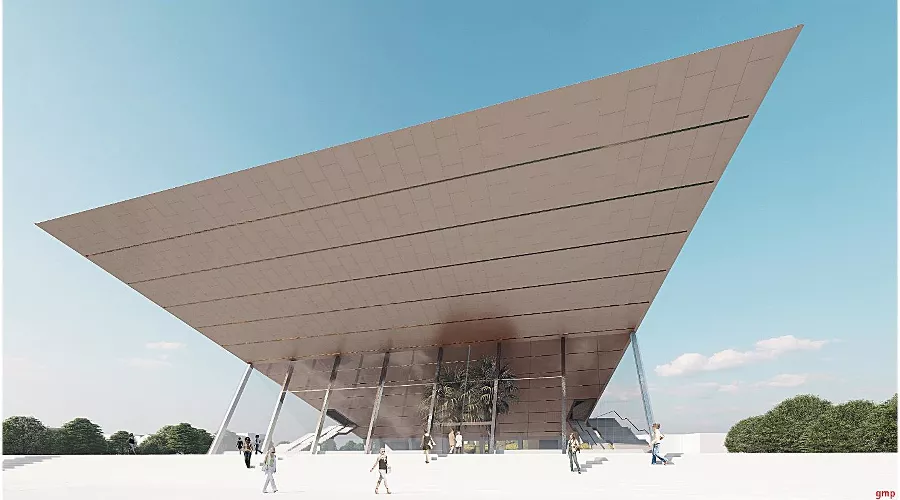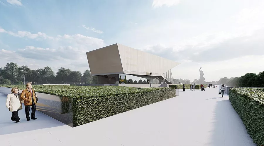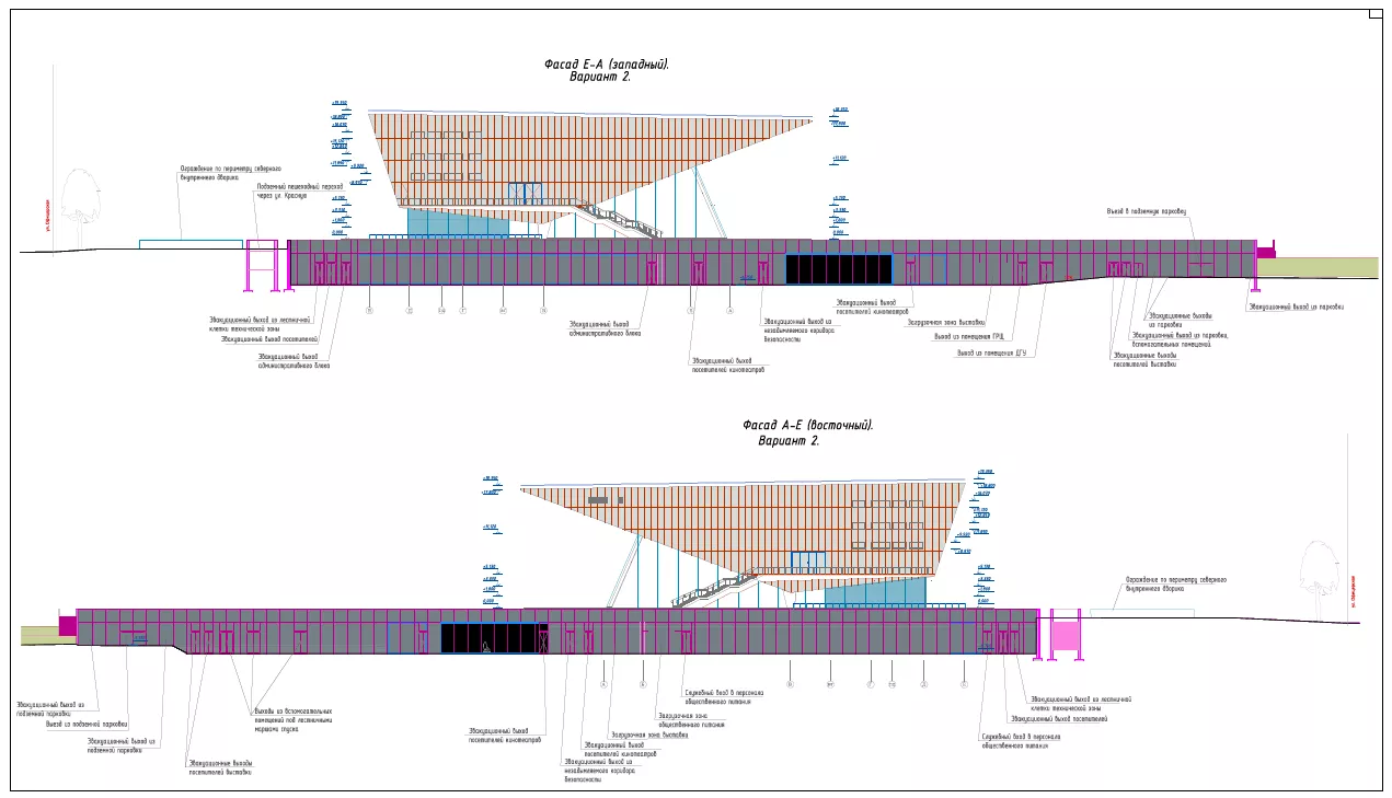 - главный, «южный», вход в новый комплекс выполнят в виде открытой лестницы, ведущей под фонтан, который накрывает собой открытое пространство перед непосредственным входом в здание, расположенным на отметке -6,75 метра;