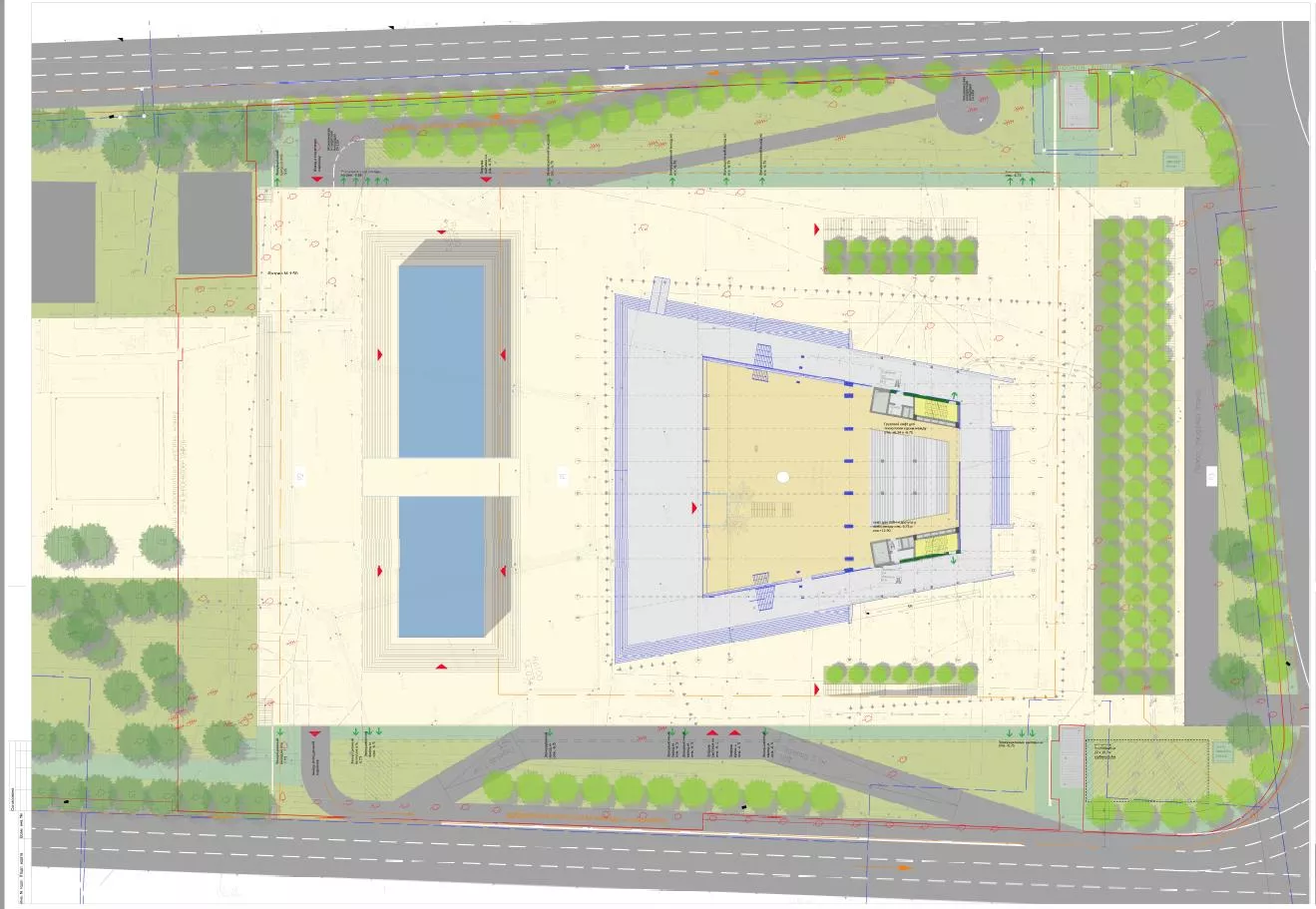 Вокруг всего комплекса высадят около 150 новых деревьев. Кроме того, на территории создадут дорожки, обустроят въезд-выезд с подземной автостоянки с Шоссе Нефтяников и улицы Красной, создадут стоянки. В подземной части планируют расположить: