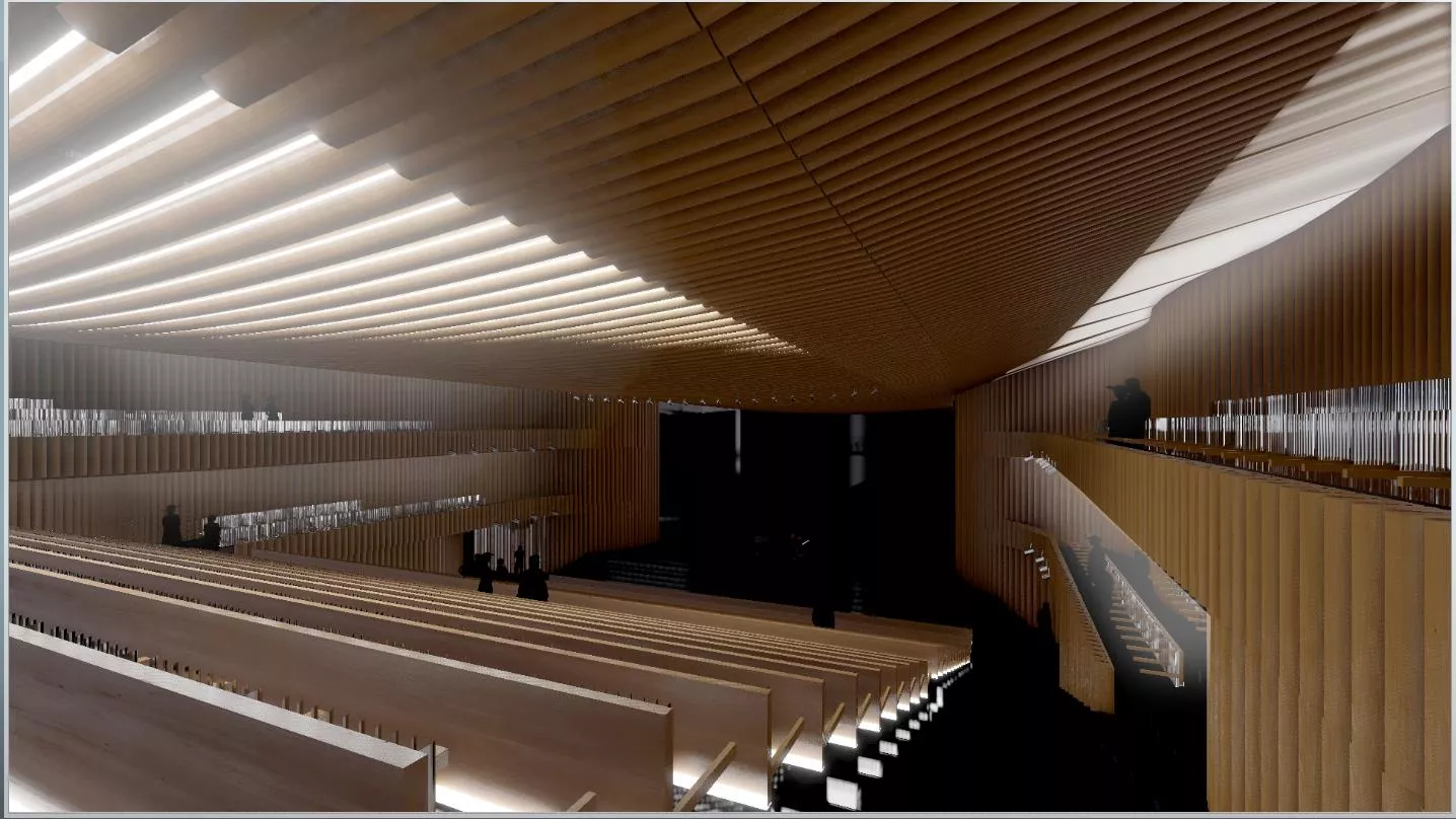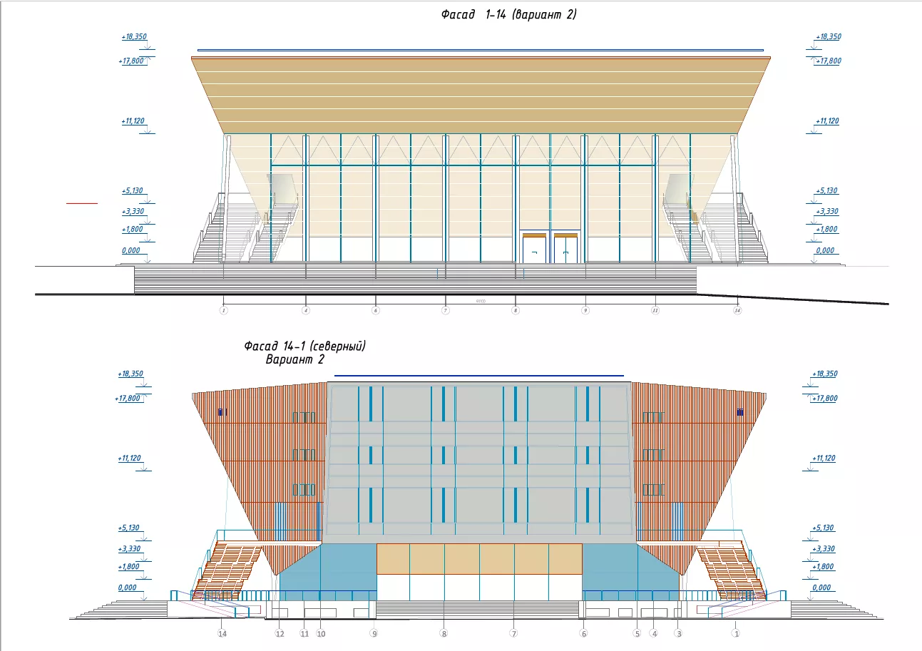 Новая облицовка пройдет по всей поверхности козырька, переходящего в потолок над фойе первого этажа, и протянется по фасаду с северной стороны. Северный витраж выполнят из светопрозрачных элементов, что обеспечит попадание дневного света в зрительный зал.