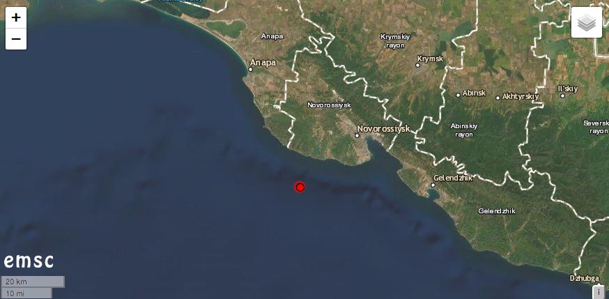 На сайте Европейско-Средиземноморского сейсмоцентра уточнили, что подземные толчки магнитудой 3,6 произошли в море на глубине 20 км. Эпицентр находился в 25 км от Новороссийска и в 22 км от поселка Мысхако.