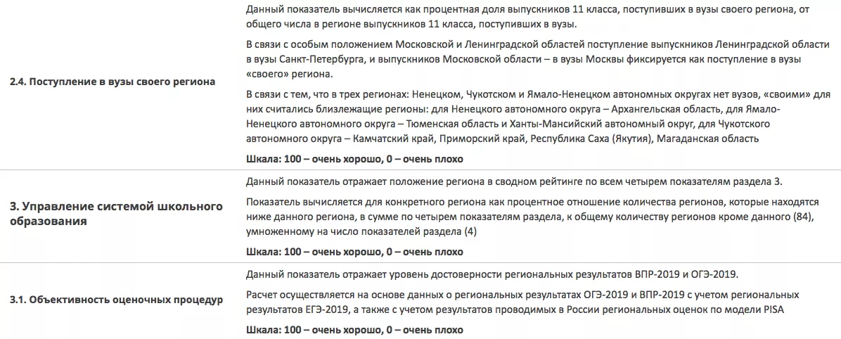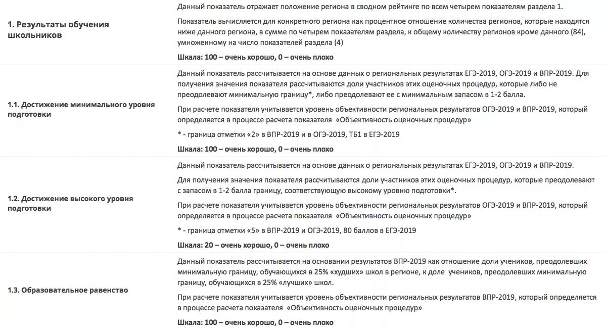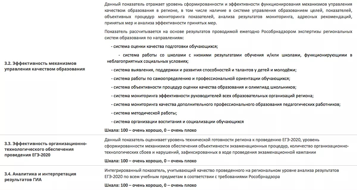 Сводный показатель Рособрнадзора отражает отражает положение региона в сводном рейтинге по всем 12 показателям из трех разделов. Шкала: 100 — очень хорошо, 0 — очень плохо. Подробнее о том, по каким критериям составляли рейтинг, можно посмотреть на сайте ведомства в разделе «описание» или на фото ниже.