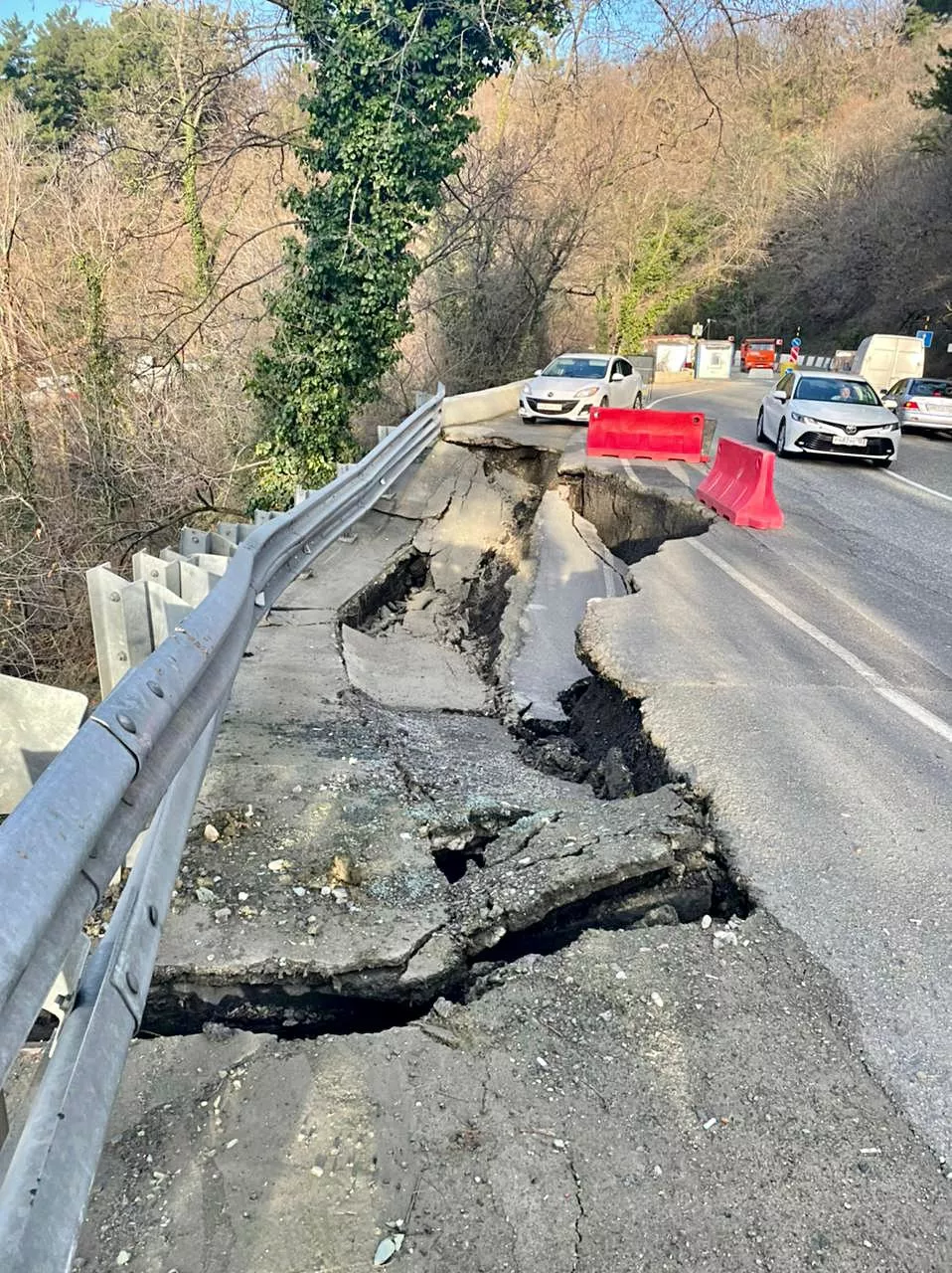 При этом в пресс-службе ФКУ Упрдор «Черноморье» прокомментировали случившееся только в 16:44. На участке федеральной трассы, у которой нет альтернативного объезда, готовятся ввести режим объектового ЧС. Сейчас там организовали реверсивное движение и ограничили скорость до 20 км/ч. Глубина образовавшегося скола дороги составляет до 3 метров, длина — до 15 метров, и ширина — до 4 метров.