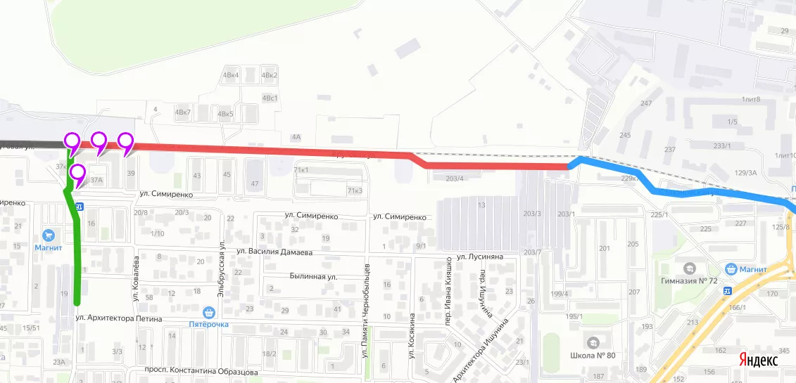 - фиолетовые метки — места, где начали устанавливать шлагбаумы.