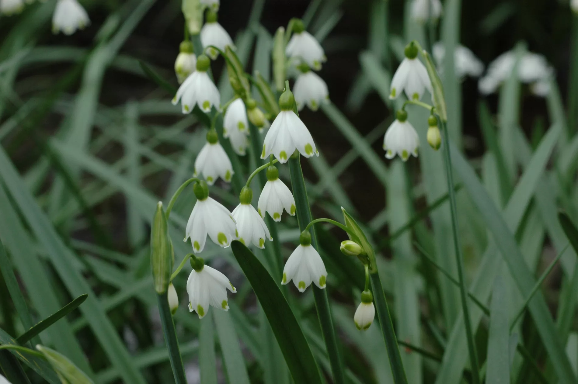 Белоцветник летний также называют летней снежинкой и снежным колокольчиком. Поникающие широкие колокольчатые цветки с шестью украшенными желтым или зеленым пятном лепестками собраны в рыхлую одностороннюю кисть из 3-6 цветков и напоминают одновременно ландыши и подснежники.