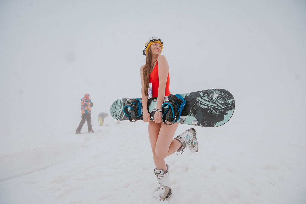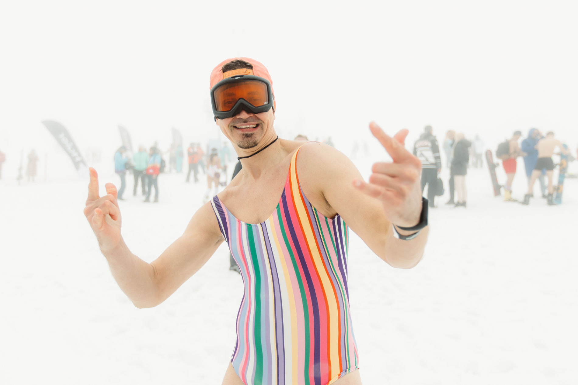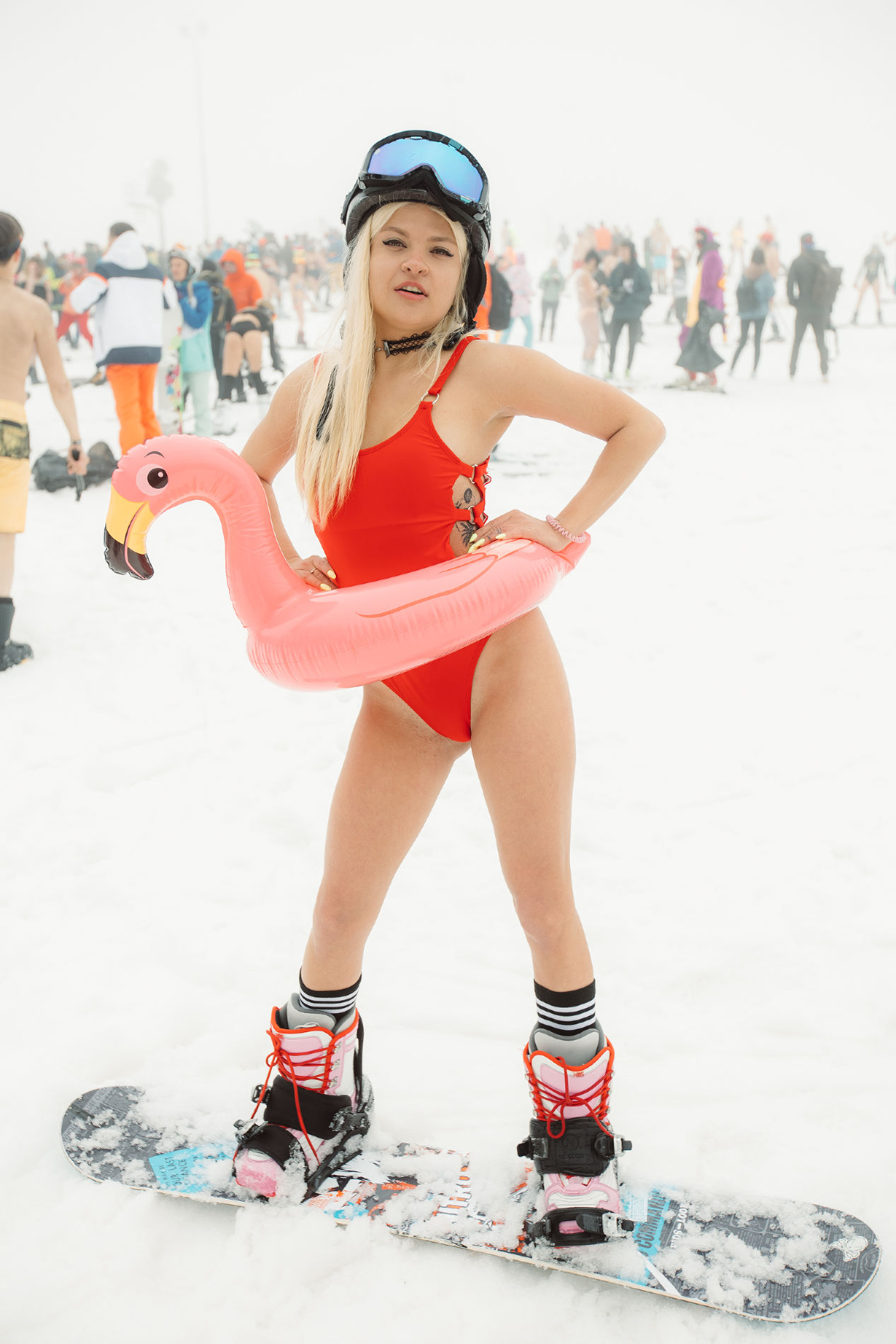 В Красной Поляне на высокогорном карнавале BoogelWoogel 10 апреля состоялся массовый спуск райдеров в купальных костюмах