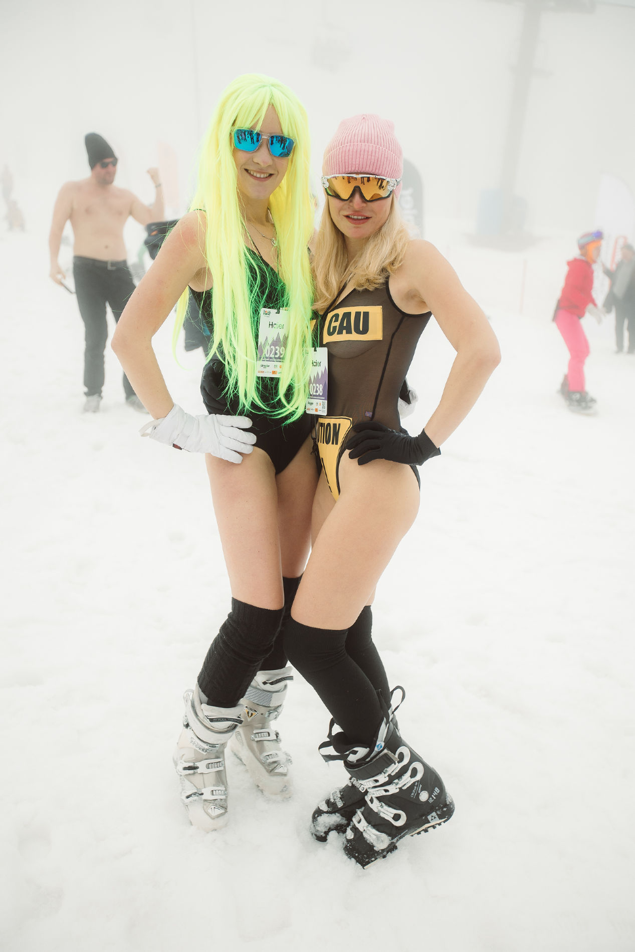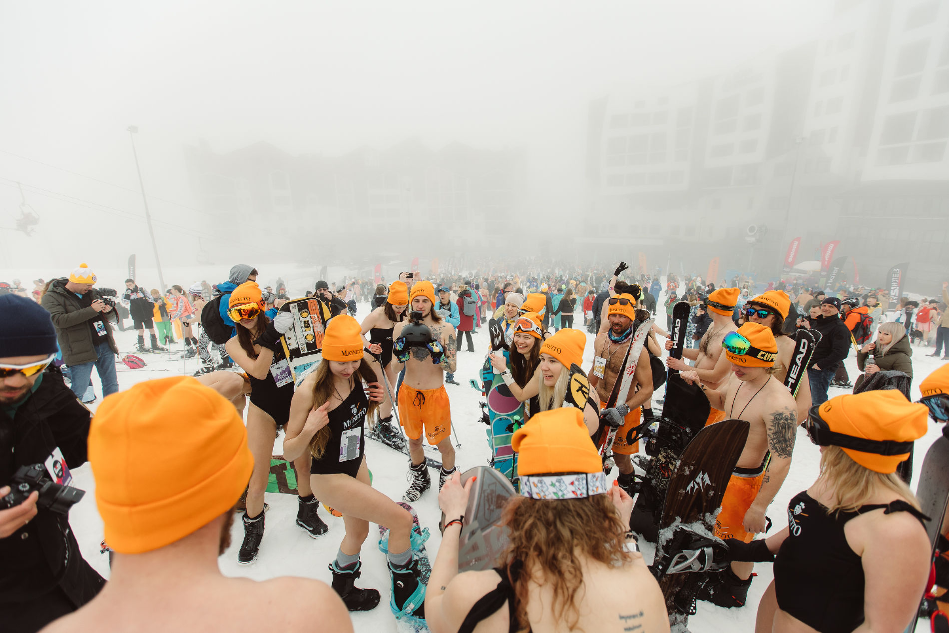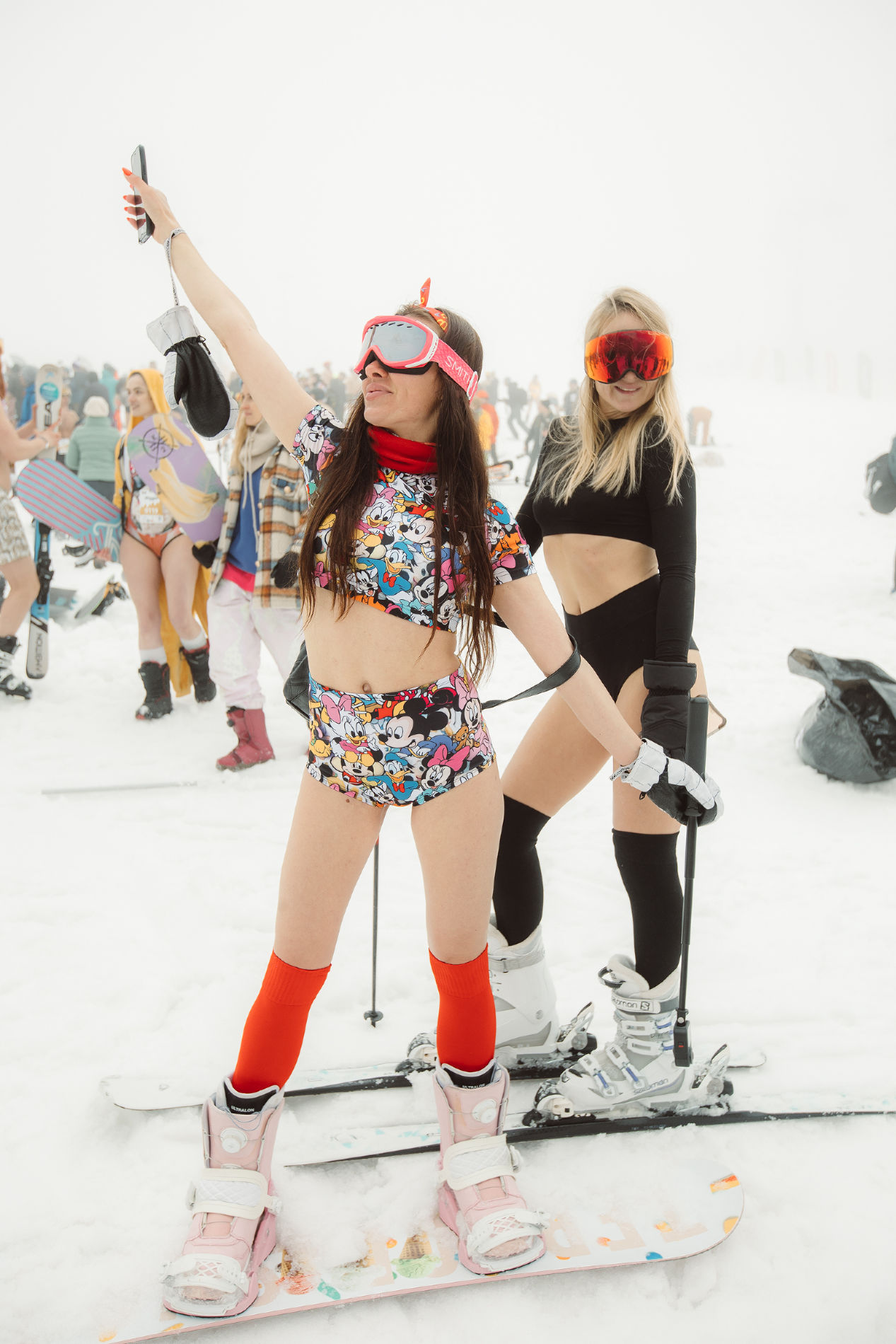В Красной Поляне на высокогорном карнавале BoogelWoogel 10 апреля состоялся массовый спуск райдеров в купальных костюмах