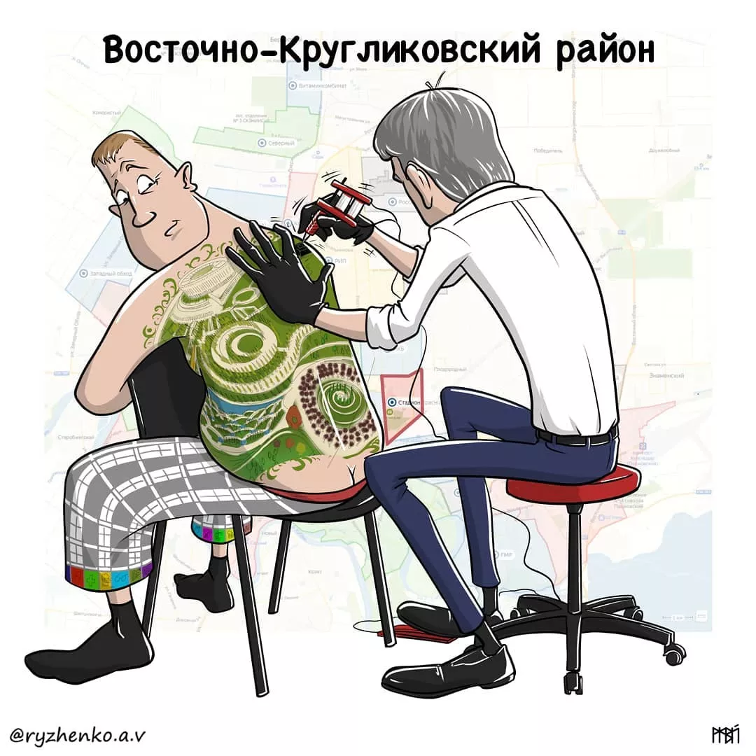 Накануне художник опубликовал арт, посвященный Восточно-Кругликовскому микрорайону. Он изобразил его в виде полноватого мужчины, на спине которого тату-мастер, похожий на бизнесмена Сергея Галицкого, набивает парк «Краснодар».