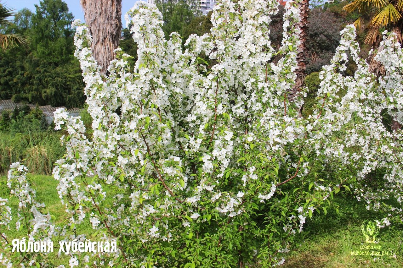 А на аллее сакур около Сада непрерывного цветения покрылась сливочно-белыми цветами яблоня хубейская. При этом по пути к ней можно наблюдать цветущие хионантус притупленный или снежноцвет, вейгелы, глицинию и сакуру. Также в дендрарии цветут ядовитый тунг Форда, клекачка Эмоди и спирея кантонская.