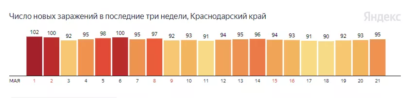 Судя по статистике оперативного штаба Краснодарского края, среди жителей региона в майские праздники наблюдался небольшой рост заболеваемости. Также с 1 по 11 мая в Сочи выявили 138 новых случаев заражения, в Анапе — 52, в Новороссийске — 40, в Геленджике — 30.