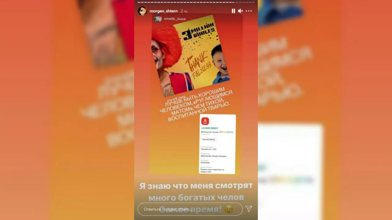 27 мая женщина сообщила, что большую сумму денег перевел рэпер Моргенштерн. Эту информацию подтвердил артист у себя в сторис.