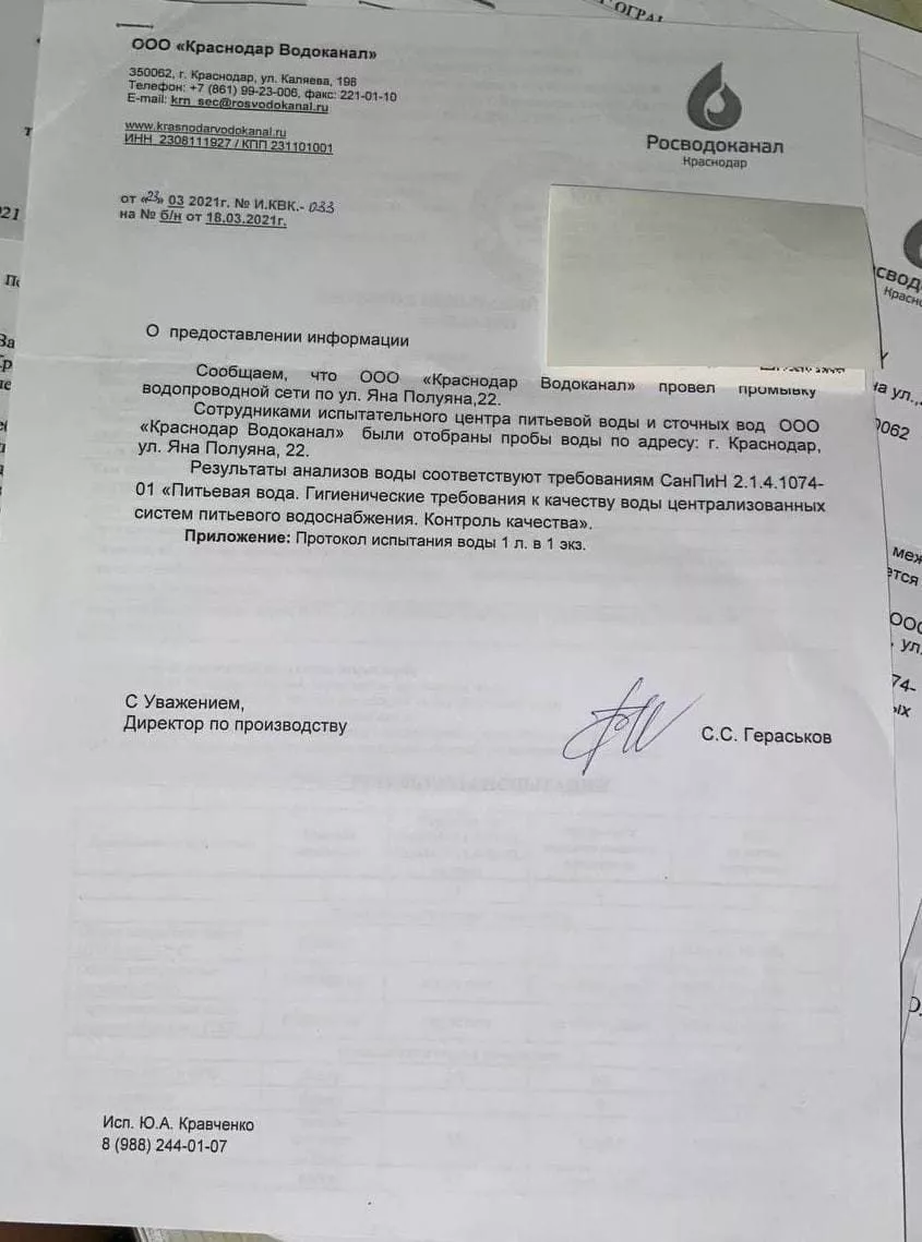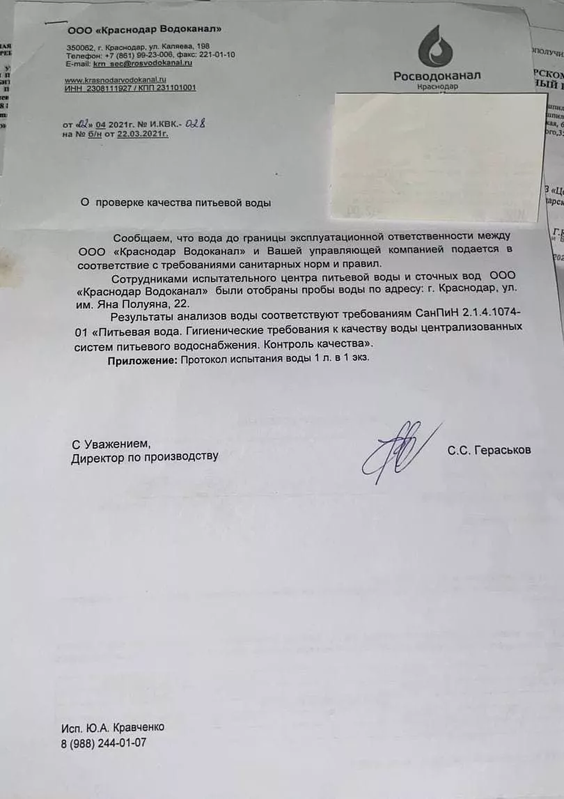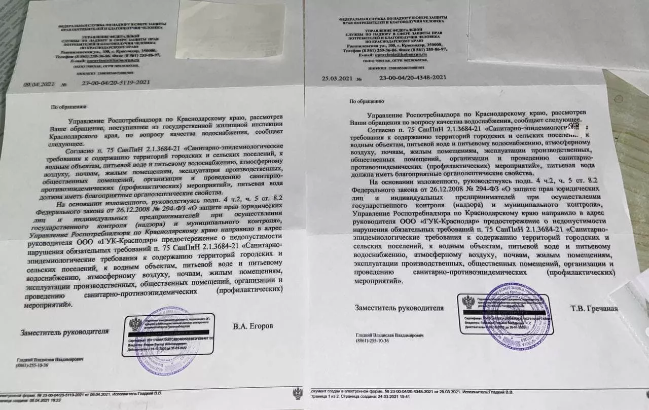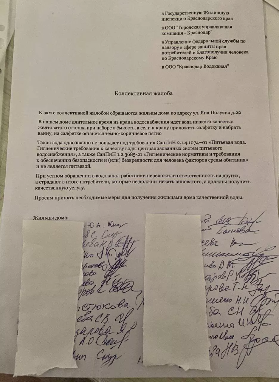 Краснодарец вместе со своей девушкой решил написать коллективную жалобу и собрать подписи жильцов дома. Подписанную жалобу отправили в ГУК «Краснодар», «Краснодар Водоканал», Роспотребнадзор, городскую мэрию и администрацию президента.