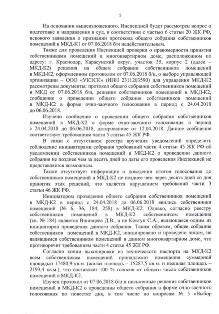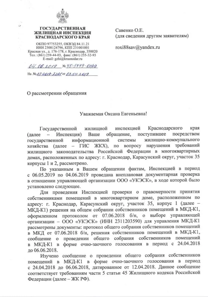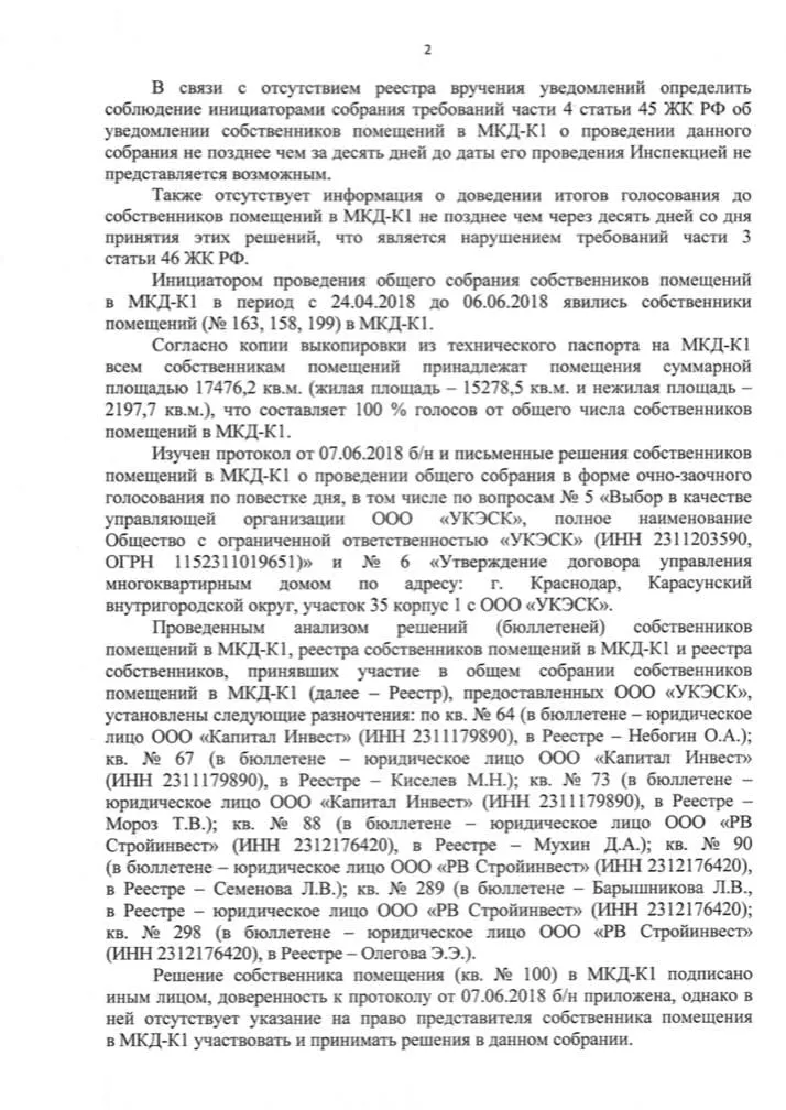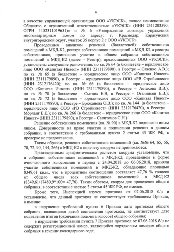 Что сделали собственники квартир? Они обратились в Государственную жилищную инспекцию. ГЖИ провела проверку первых протоколов 2018 года, которые подтверждали мнимое избрание ООО «УКЭСК-ЮГ». После чего ГЖИ направила иск в суд по ч. 6 ст. 20 ЖК РФ о признании протокола общего собрания собственников недействительным, отказала во внесесении изменений в реестр лицензий, возврате заявления и документов. То есть у компании «УКЭСК-ЮГ» нет лицензии на управление домами ЖК «Грин Парк».