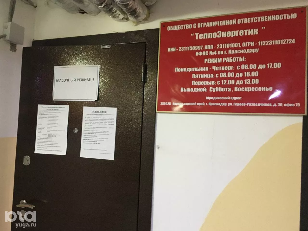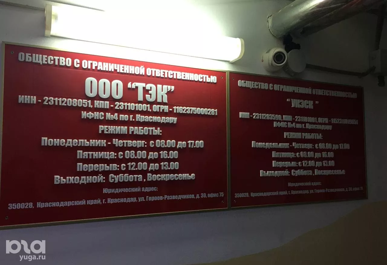 После того как представители УК «Кубань» вместе с журналистом приехали по адресу, обнаружилось, что никого из сотрудников там нет. Тем не менее около кабинета расположена вывеска «УКЭСК-ЮГ» и юридически головной офис компании зарегистрирован там.