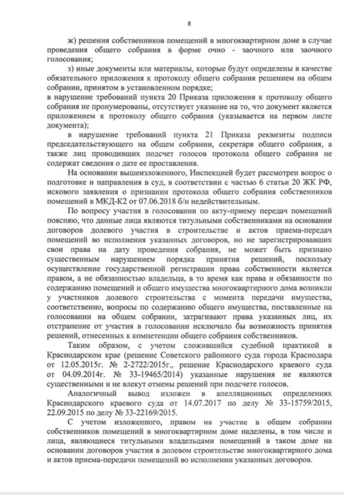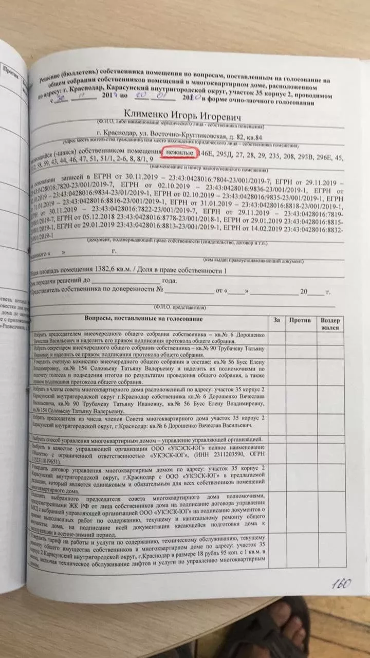 Юлия рассказала журналисту Юга.ру, что в тот период квартиры еще не поставили на кадастровый учет и подсчитать голоса было невозможно. Инициатором, секретарем и председателем собрания выступили лица, которые на момент голосования не являлись собственниками.