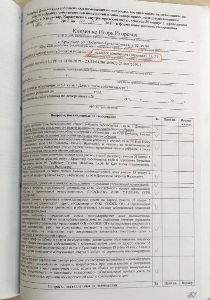 Иски в суд направили жильцы «Грин Парка» И. Клименко и С. Рябченко. В бюллетене голосования Клименко является собственником нескольких нежилых помещений. В том числе парковочного места Юлии, которое она арендует вместе с мужем. Однако, подчеркнула женщина, собственником является другой человек, а не Клименко.