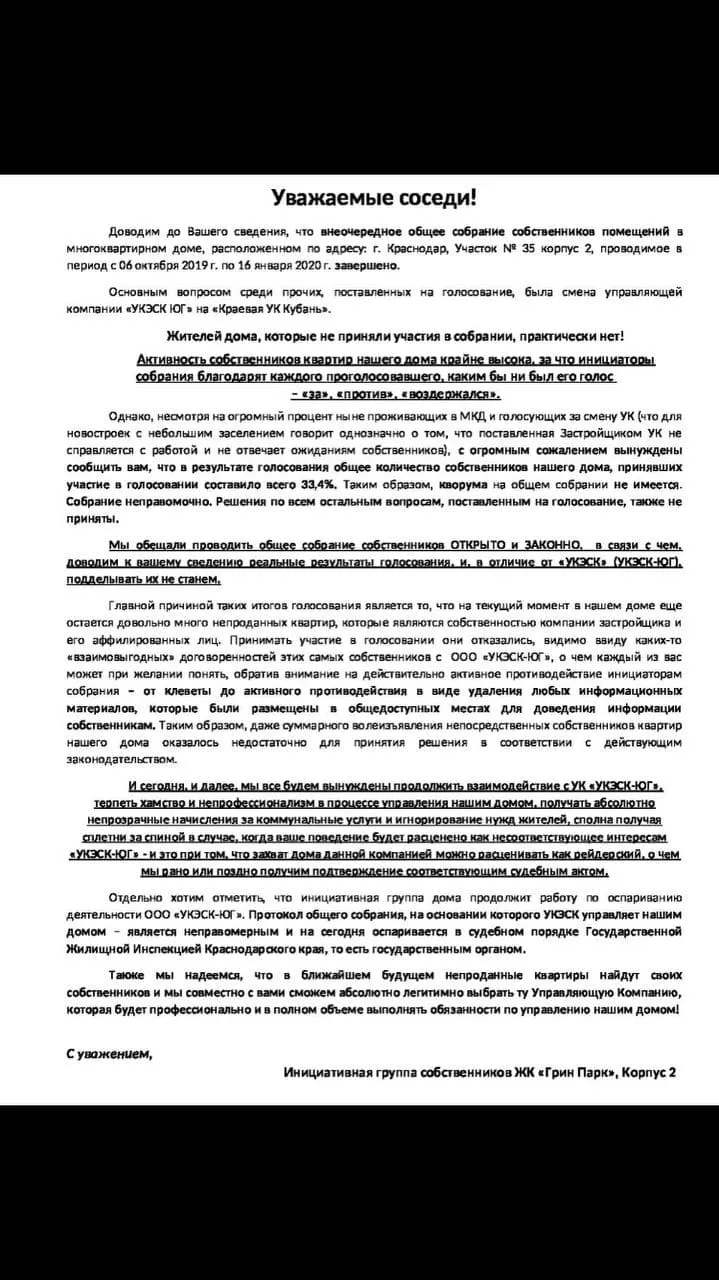 А дальше что? 1 июня собственники составили заявления в полицию и ГЖИ по вопросу отказа «УКЭСК-ЮГ» предоставлять документы и передавать дома в управление УК «Кубань». Также жители ЖК «Грин Парк» написали заявления с просьбой проверить деятельность «УКЭСК-ЮГ».