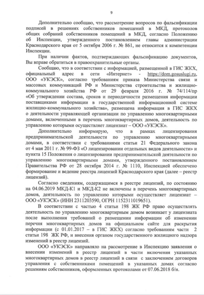 На вопросы представителей «Кубани», почему компания продолжает обслуживать дома без лицензии, юрист «УКЭСК-ЮГ» ответить не смог. Также он не объяснил, почему компании не предоставили оригиналы, а прислали копии. Когда можно будет увидеть оригинал, тоже неизвестно.