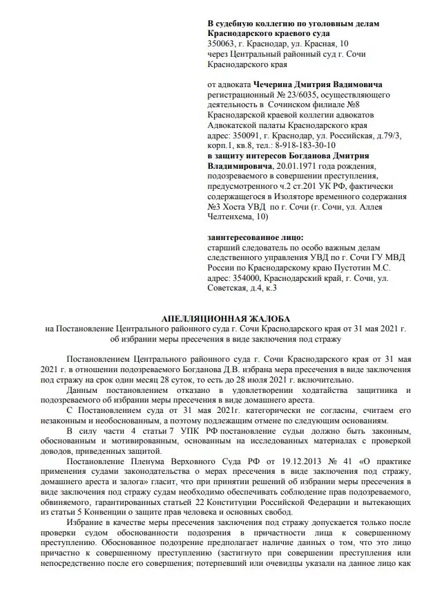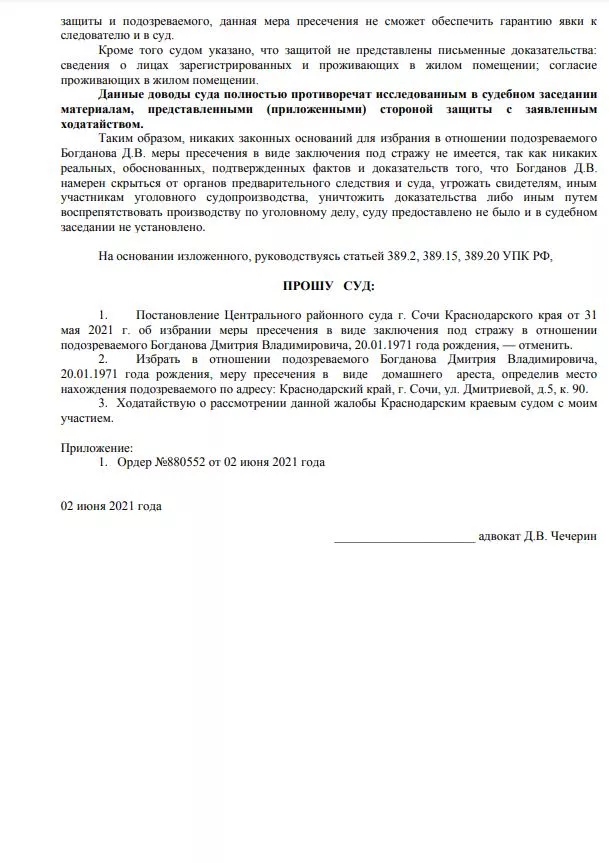 «Мы подали ходатайство об избрании меры пресечения в виде домашнего ареста. В кратчайшие сроки собрали максимальный характеризующий материал. При избрании меры пресечения следствие ссылалось на то, что он может скрыться в связи с тем, что он улетел в Ялту. Мы доказали обратное. Билеты были куплены заранее, всем было известно о поездке в Ялту, Instagram он активно ведет. События, которые он посещал, широко освещались», — сказал он.