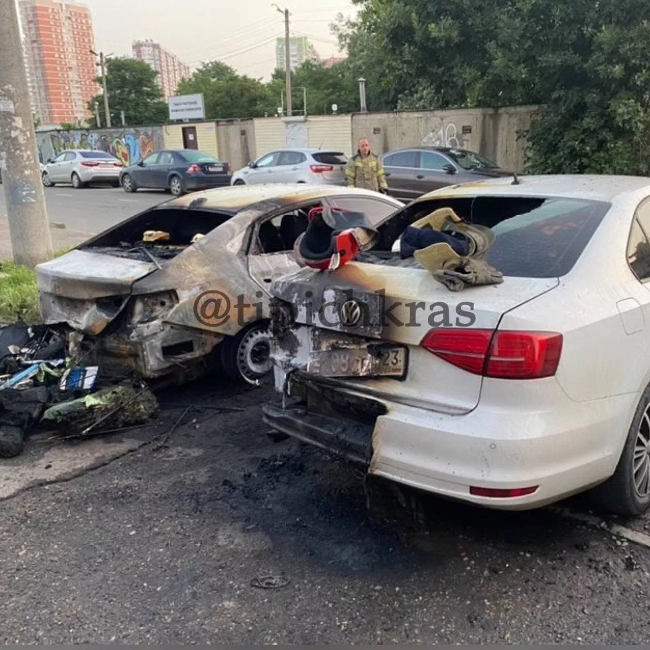Как рассказали порталу Юга.ру в пресс-службе УМВД по Краснодару, в качестве одной из причин пожара рассматривается умышленный поджог Hyundai Solaris, вследствие которого огонь перекинулся на Volkswagen Jetta, который стоял рядом.