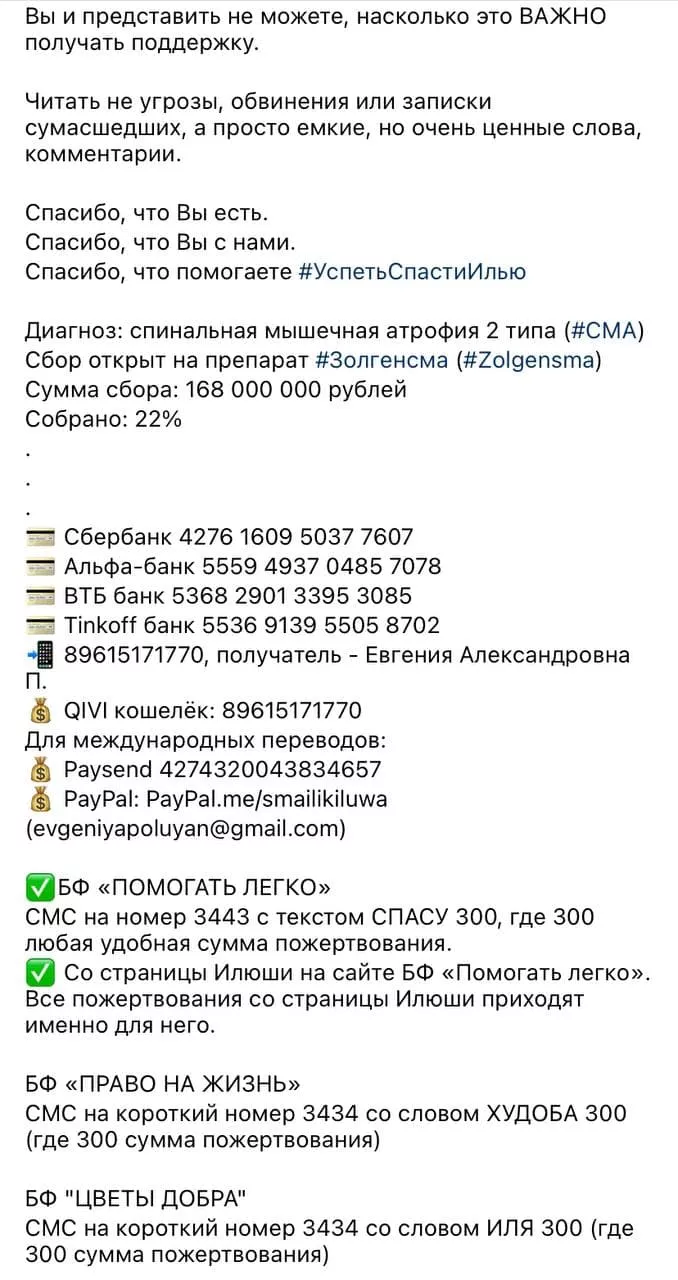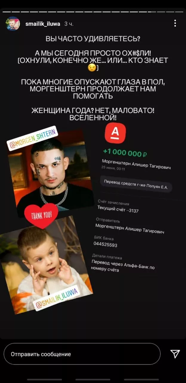 Напомним, трехлетний Илья Худоба из Тимашевска болен спинальной мышечной атрофией второго типа. Ребенку необходимо 168 млн рублей на укол «Золгенсма». 26 мая мама мальчика сообщила в инстаграме, что рэпер Моргенштерн перевел на их счет 3 млн рублей.