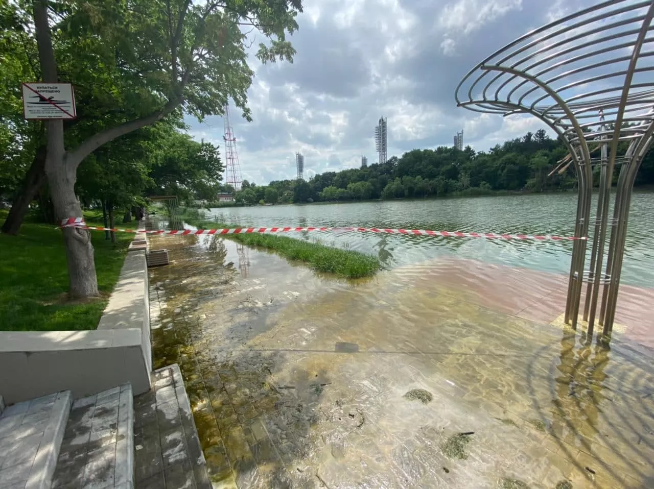 Власти Краснодара 28 июня закрыли тротуар в Дмитриевском сквере, после того как озеро вышло из берегов и затопило его