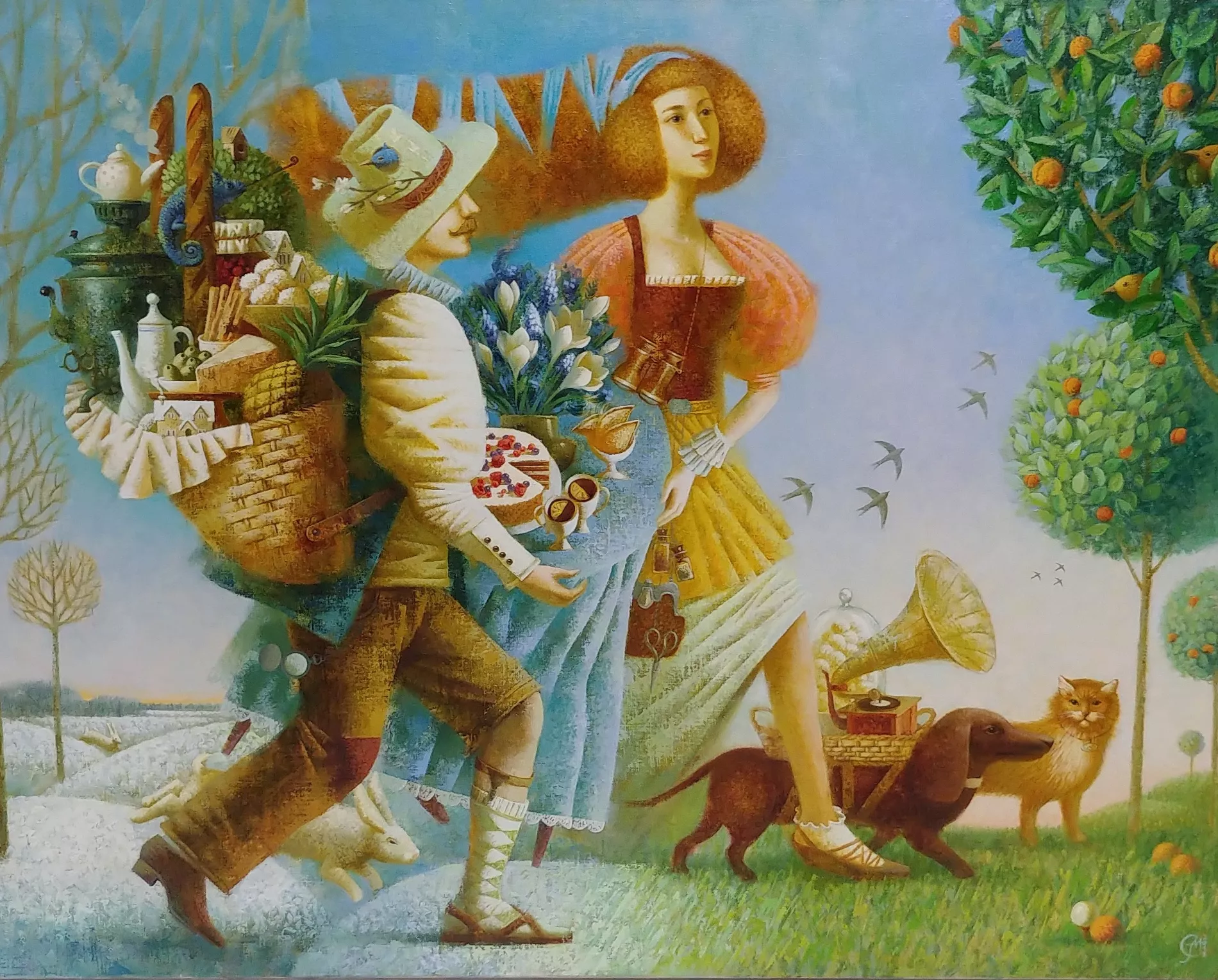 Представлены живописные работы художницы из серии «Истории любви» и мозаичные панно. В основе сюжетов — деревенская жизнь, истории людей, детские воспоминания, грезы и сны. Как сообщили в галерее, в работах Марии чувствуется ее стремление создать свой рай.