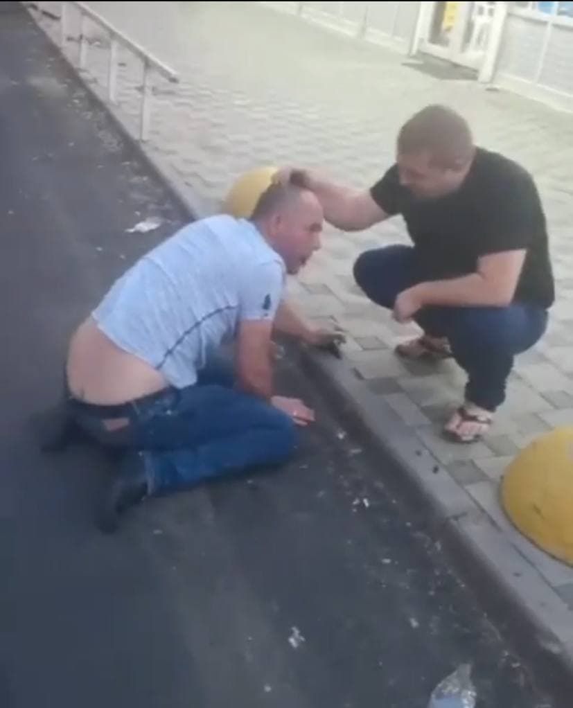 «Майор, ты старший уполномоченный, да? Ты бетмен *** бухой за рулем на «Туареге» 861. На кого ты прыгал, мразь? Ты, ***, не перепутал, щеночек?» — говорит мужчина в черной одежде и несколько раз бьет полицейского по голове.