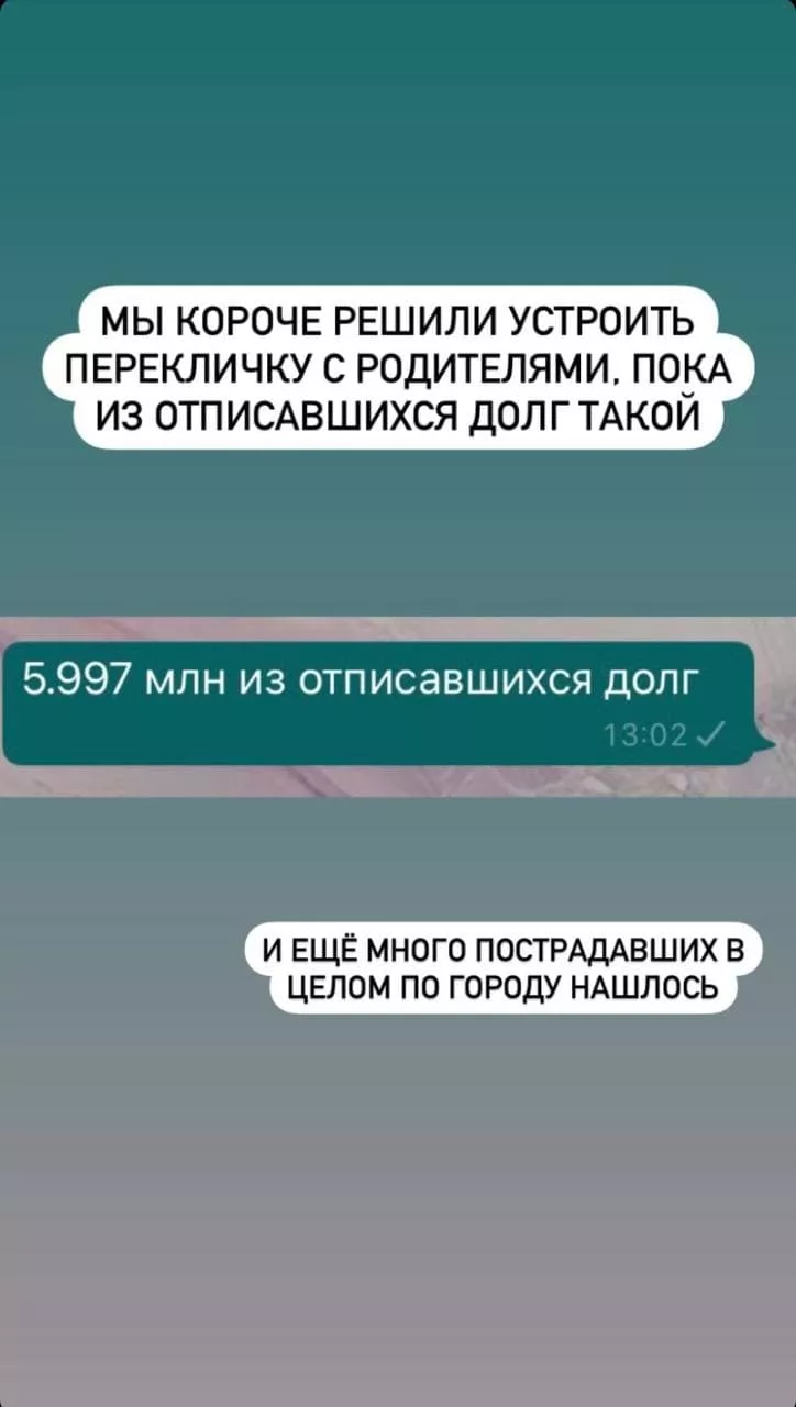 Родители подсчитали, что долг Цаплиной составляет 5 млн 997 тыс. рублей. Но это не вся сумма — есть еще родители, которые пока не сообщили о сумме, которую заняли.