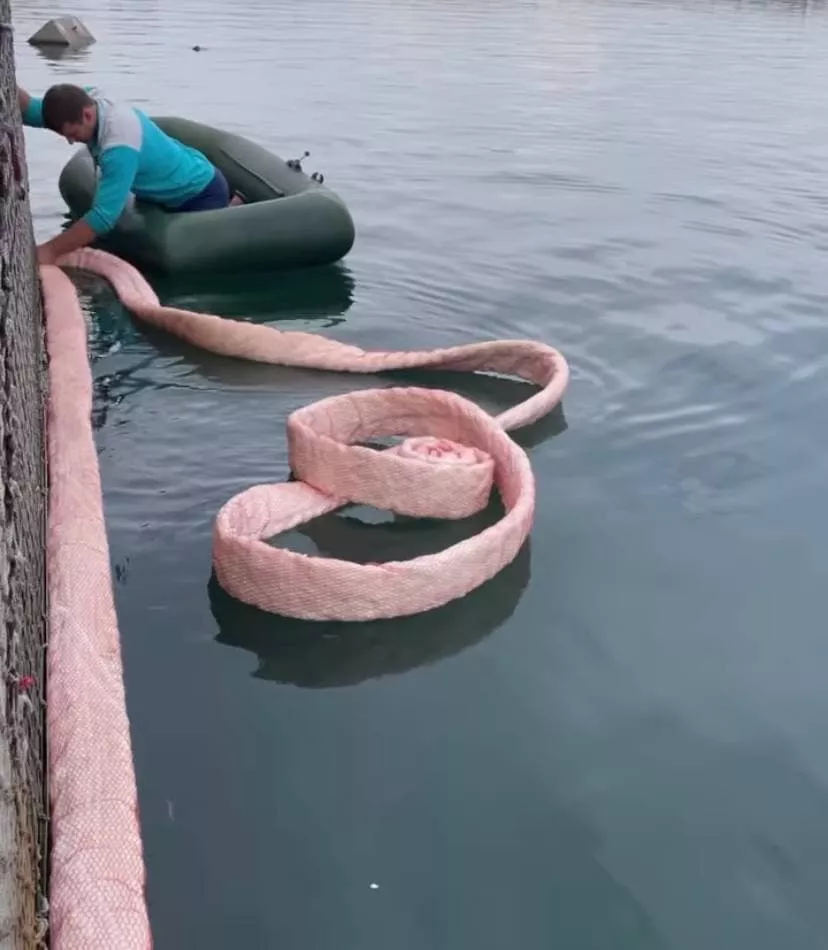 Специалисты очищали воду лентами сорбирующего бона. Он, как огромная губка, притягивает и впитывает масляную пленку с поверхности воды, не давая её проникнуть в вольеры и навредить животным.