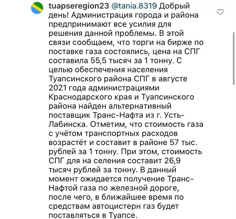 17 августа журналист Юга.ру снова связался с пресс-службой Туапсинского района, чтобы проверить ситуацию. Представитель администрации сказал, что не может дать ответ по новым поставкам газа. Этим занимается самостоятельная организация «Туапсегоргаз», а администрацию они не информируют.