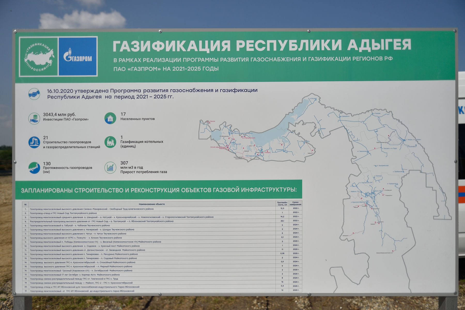 17 августа состоялась церемония открытия межпоселкового газопровода протяженностью 9,28 км. Это часть проекта «Эстафета газа» по газификации Адыгеи.
