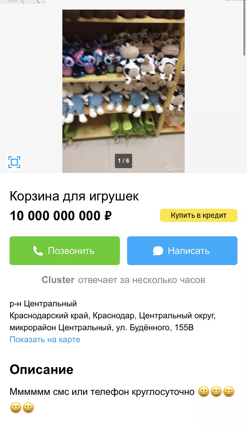 Журналист портала Юга.ру 7 сентября решила найти эти объявления, но на «Авито» их уже не было. Зато нашлось кое-что поинтереснее. Например, корзина для игрушек за 10 млрд рублей.