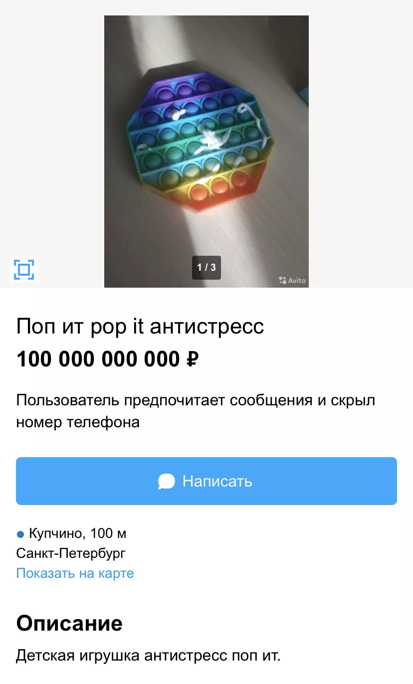 Дорогостоящие игрушки продают не только в Краснодаре. За 100 млн в Йошкар-Оле готовы продать мягкие детские игрушки (можно купить даже сразу пакетом), в Чебоксарах коллекцию детских машинок продают за 100 млрд, и по такой же цене в Санкт-Петербурге можно купить всем известную антистресс-игрушку поп-ит. Но вряд ли игрушка за такую стоимость снимет стресс.