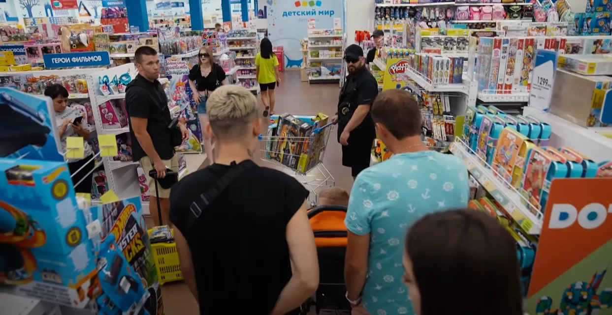 Потом Илья вместе с папой и Моргенштерном поехали в «Детский мир». Там артист стал скупать все игрушки, на которые показывал мальчик, а также фотографироваться с поклонниками.