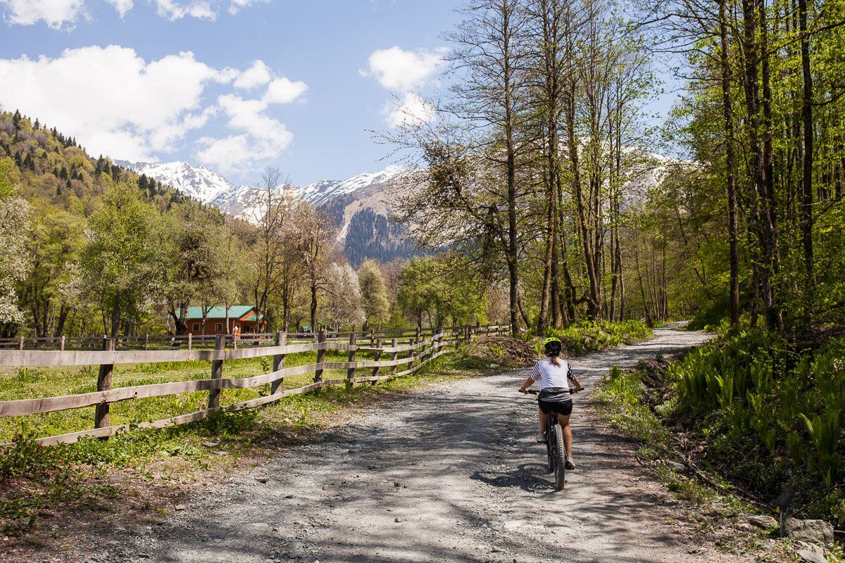 Велосипедисты могут выехать с курорта «Роза Хутор» и добраться до Харгинского леса, Долины нарзанов, Священной рощи, Хмелевских озер, проехать по старинному шелковому пути.