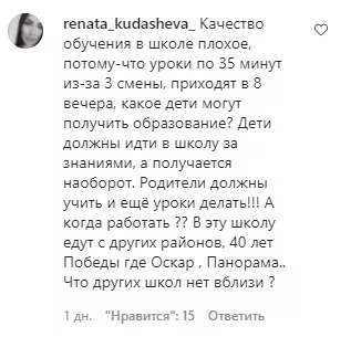 «В 3 смену учатся мои дети, 2–3 класс, когда старшие учатся в первую! Когда это было видано, дети по темноте домой возвращаются», — прокомментировала renata_kudasheva_.